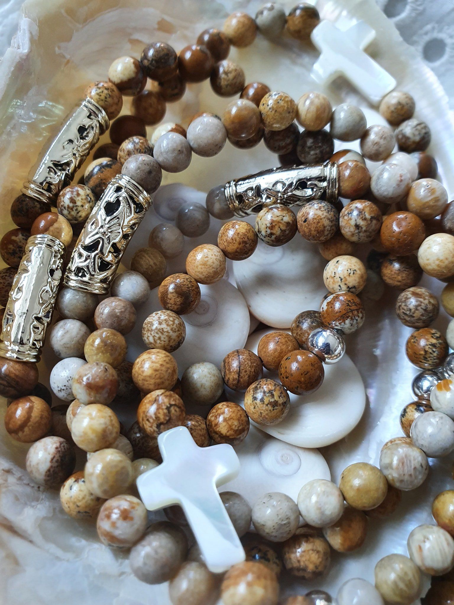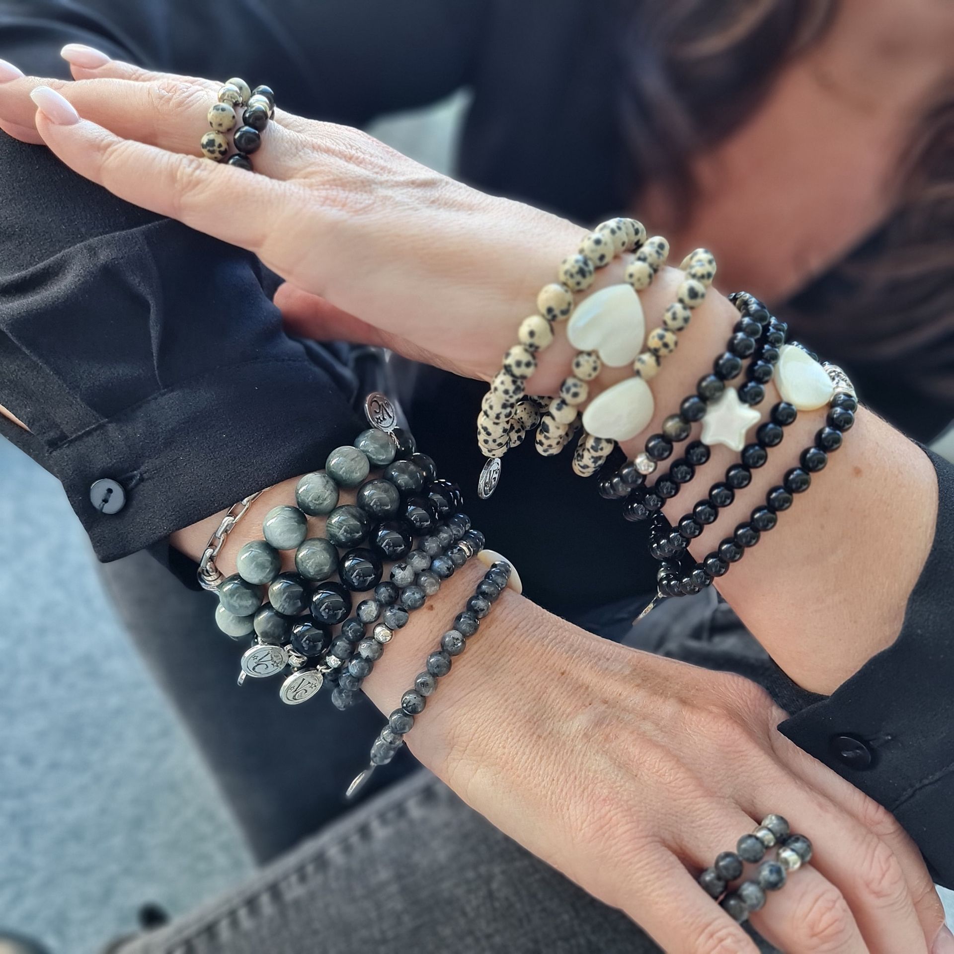 Bracelets avec un sujet confectionnés de pierres naturelles jaspe clair, turquoise bleu, agates noires, œil de Tigre, pierres fossile de rivière, jaspe dalmatien, turquoise verte d'Afrique, lapis-lazuli, turquoise jaune-noire, amazonite, jaspe d'été impérial, aventurine, obsidienne, rhodonite.