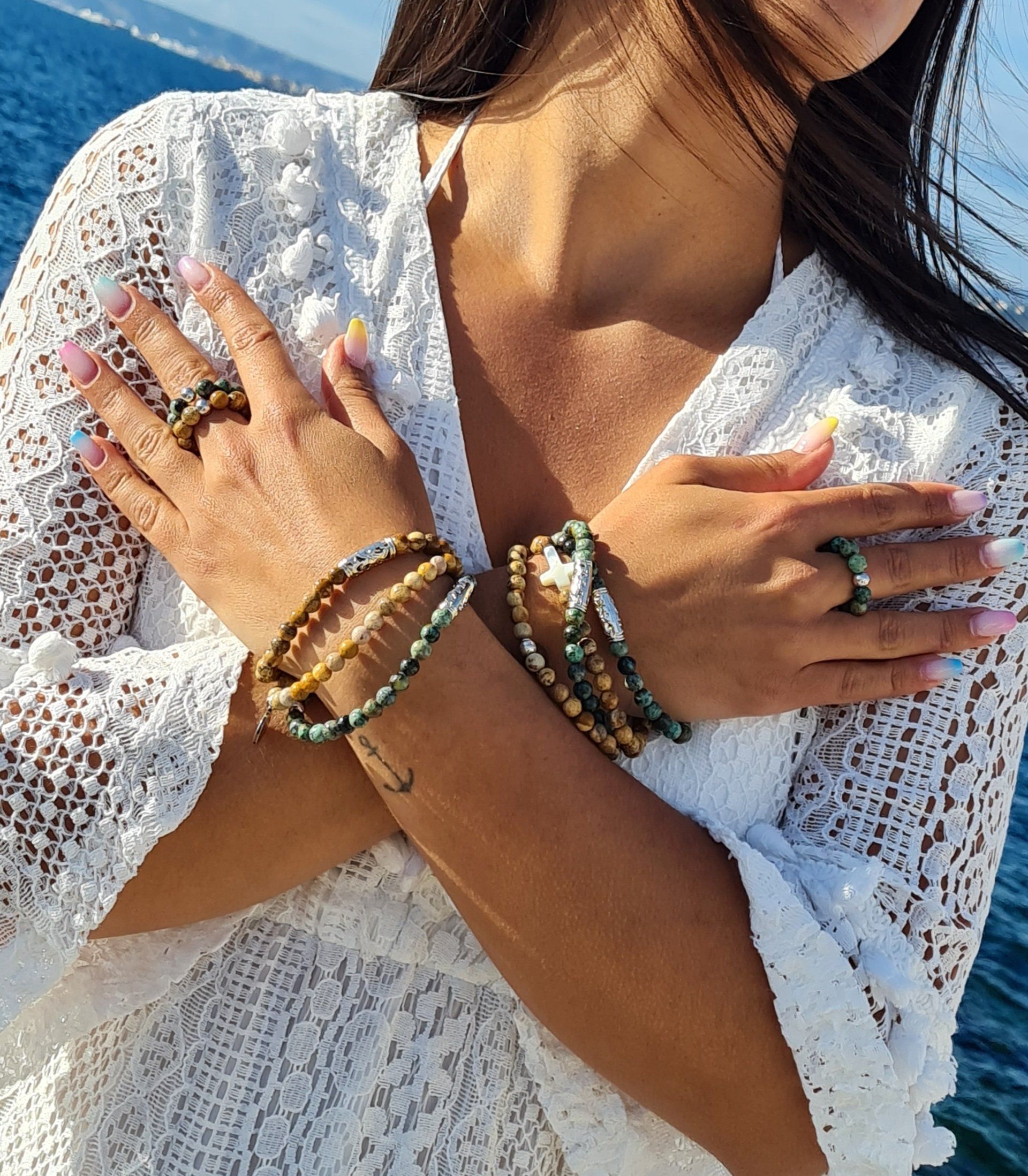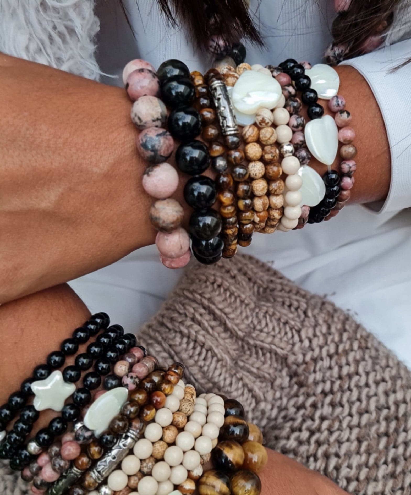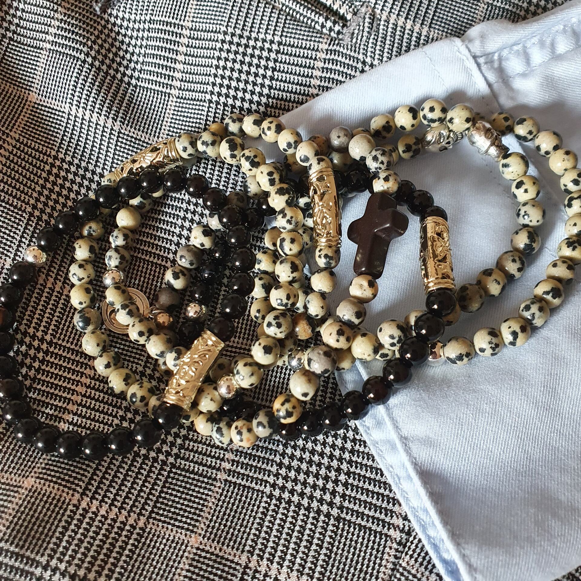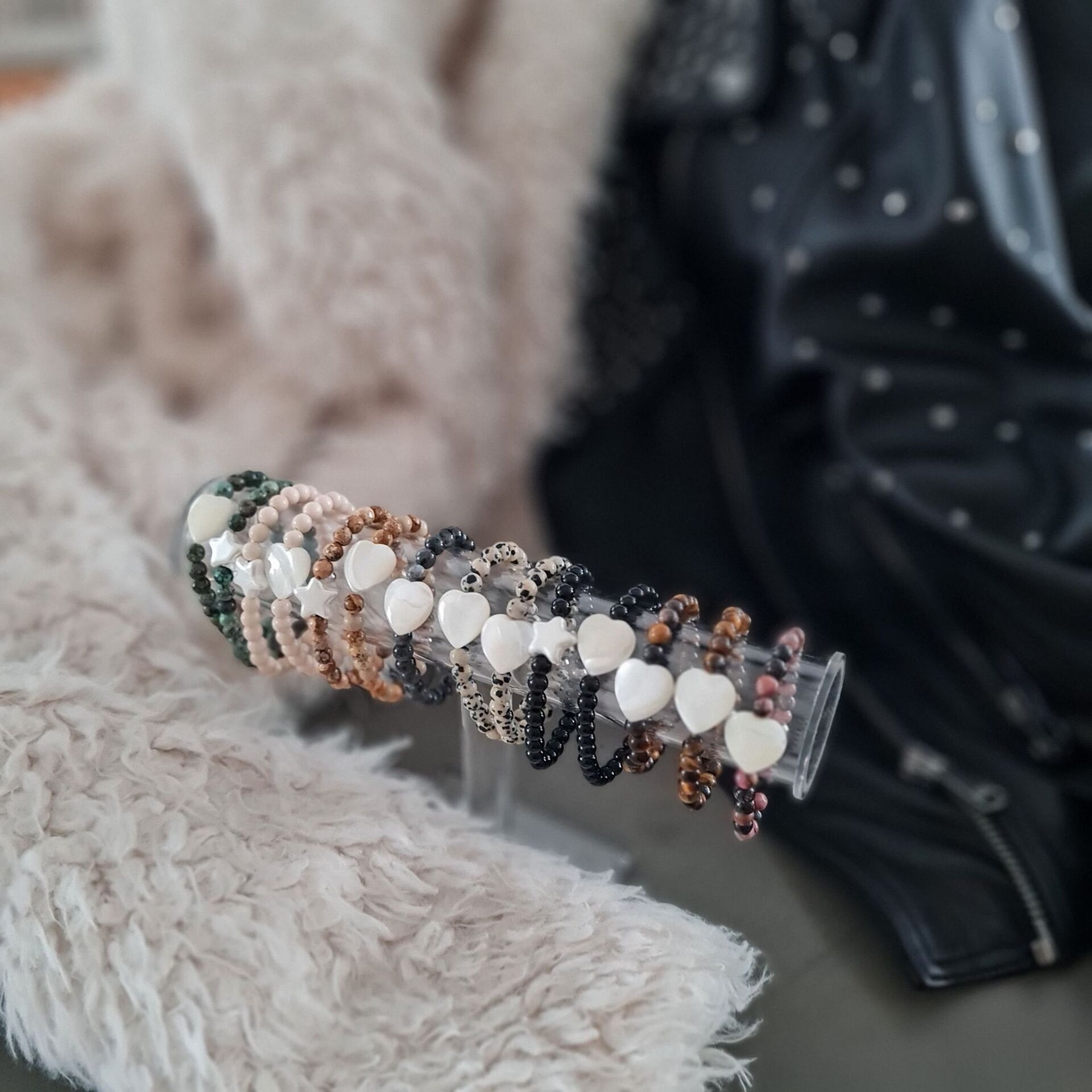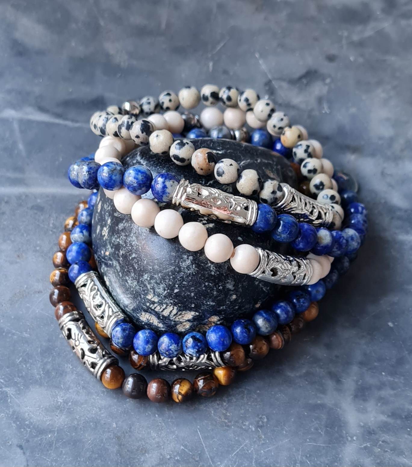 Bracelets avec un sujet confectionnés de pierres naturelles jaspe clair, turquoise bleu, agates noires, œil de Tigre, pierres fossile de rivière, jaspe dalmatien, turquoise verte d'Afrique, lapis-lazuli, turquoise jaune-noire, amazonite, jaspe d'été impérial, aventurine, obsidienne, rhodonite.