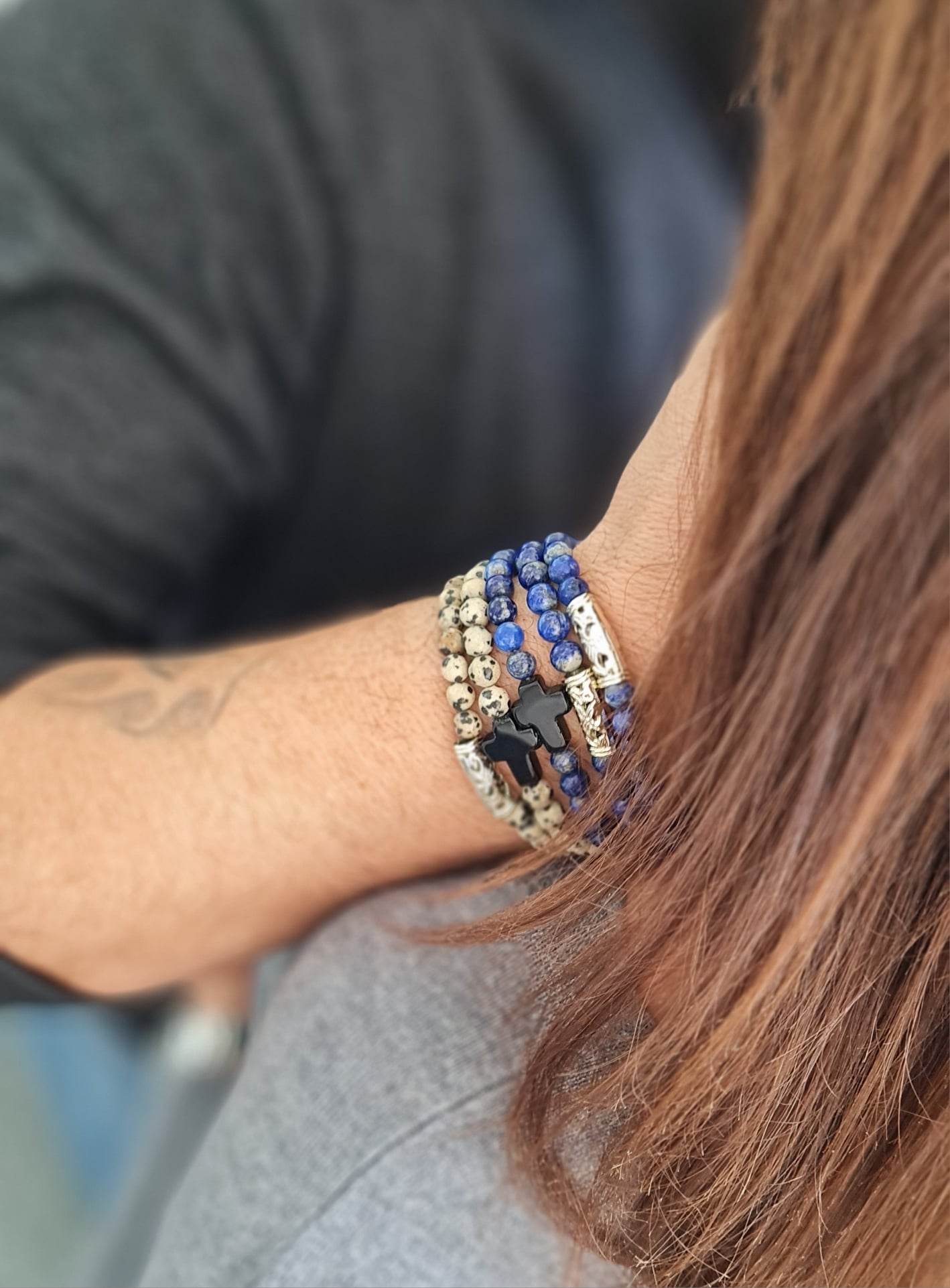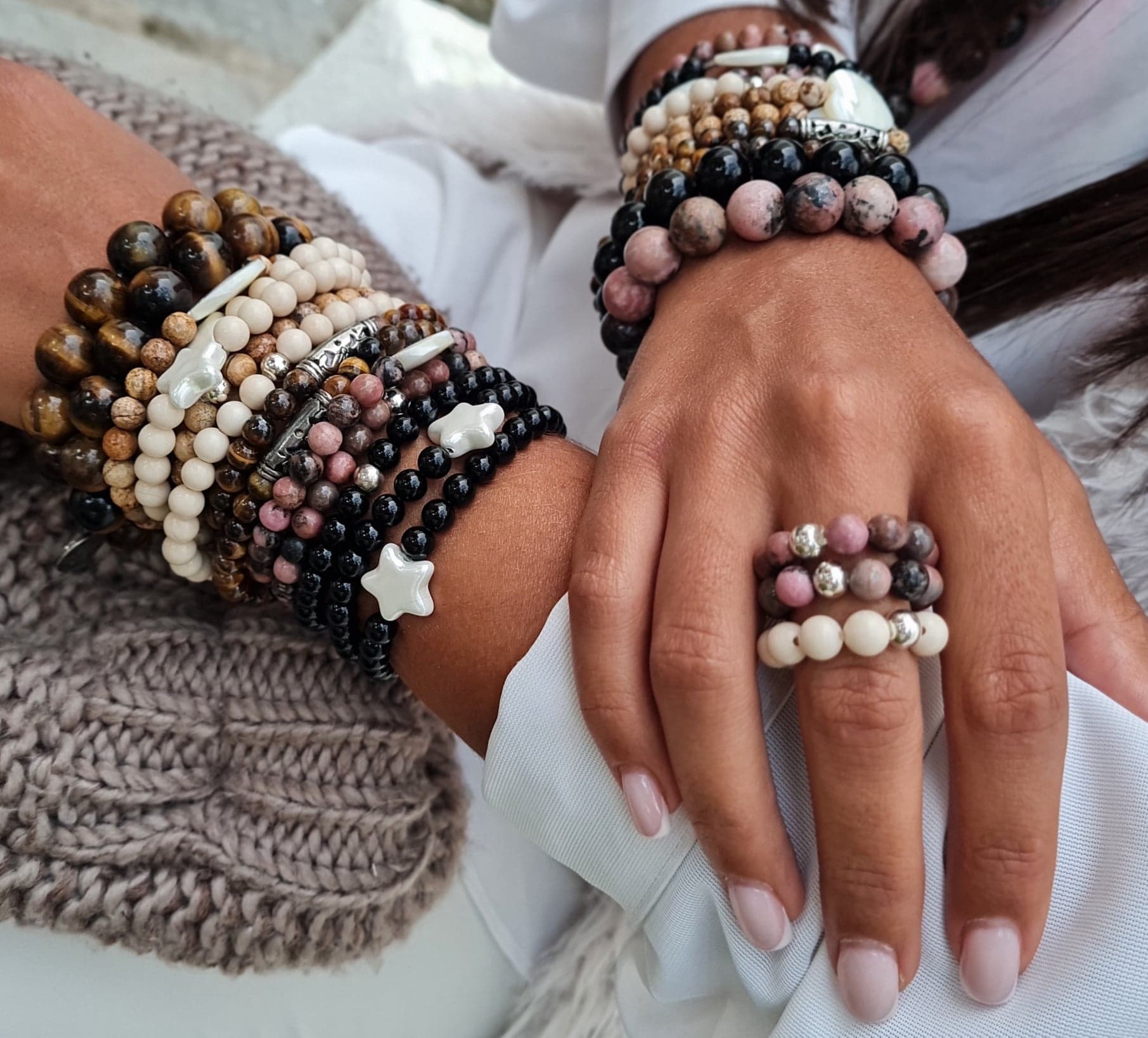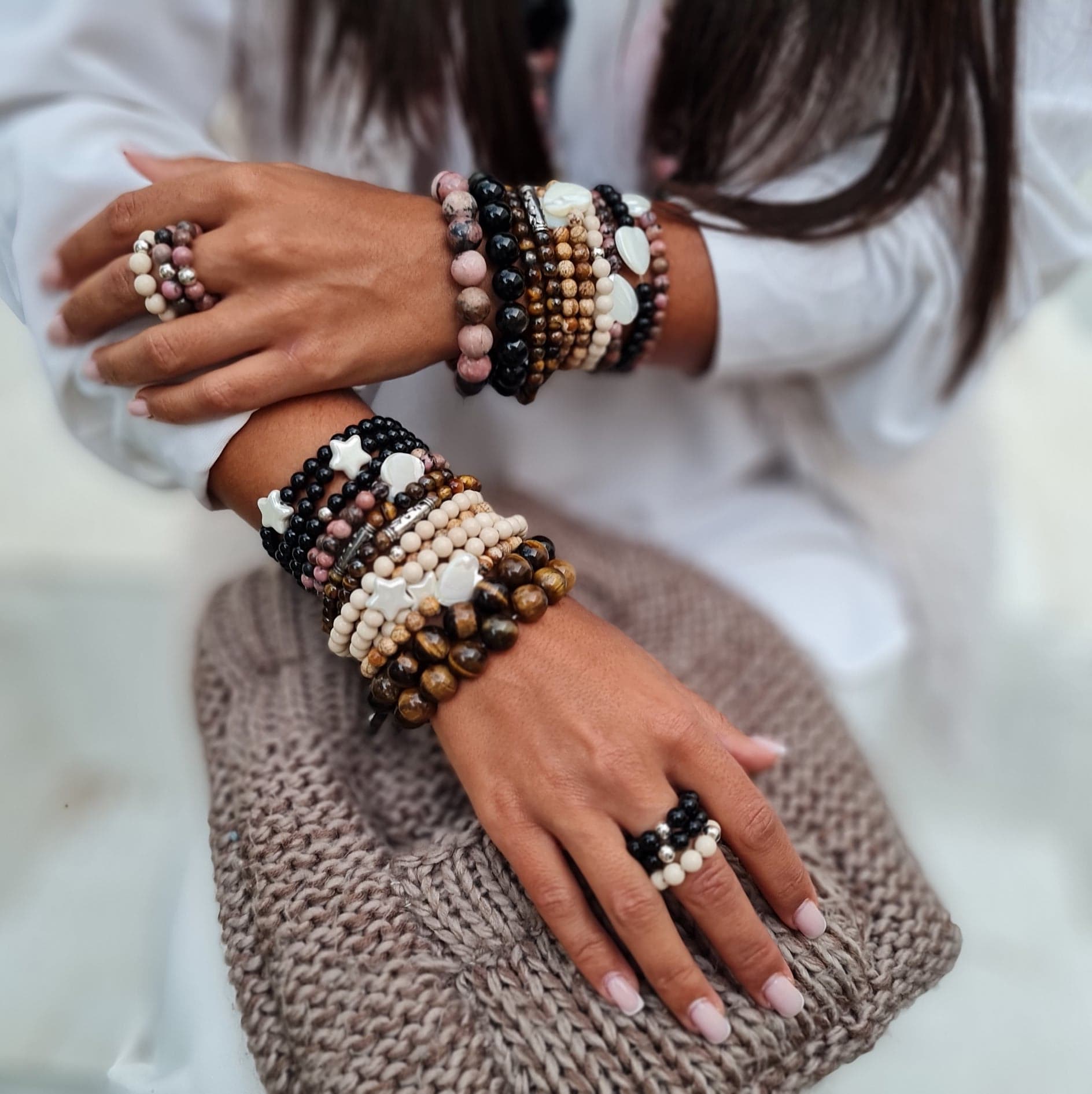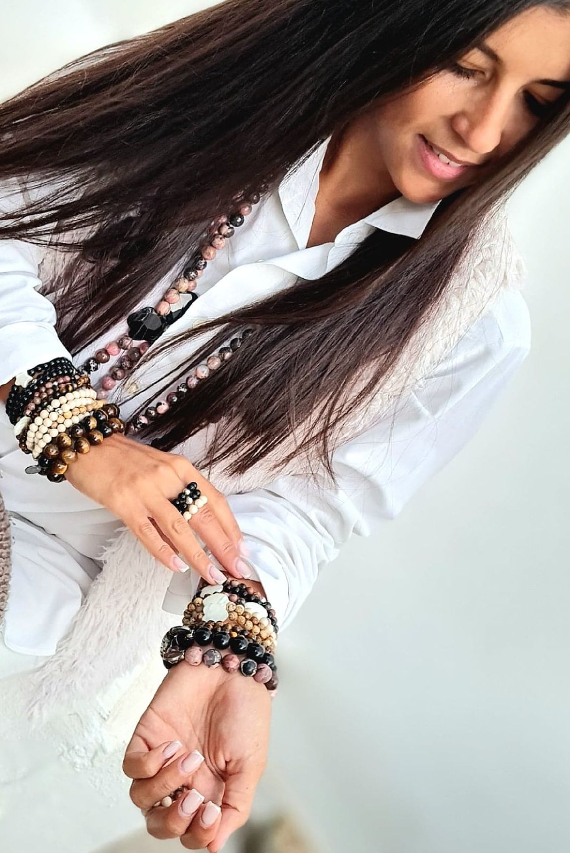 Bracelets avec un sujet confectionnés de pierres naturelles jaspe clair, turquoise bleu, agates noires, œil de Tigre, pierres fossile de rivière, jaspe dalmatien, turquoise verte d'Afrique, lapis-lazuli, turquoise jaune-noire, amazonite, jaspe d'été impérial, aventurine, obsidienne, rhodonite.