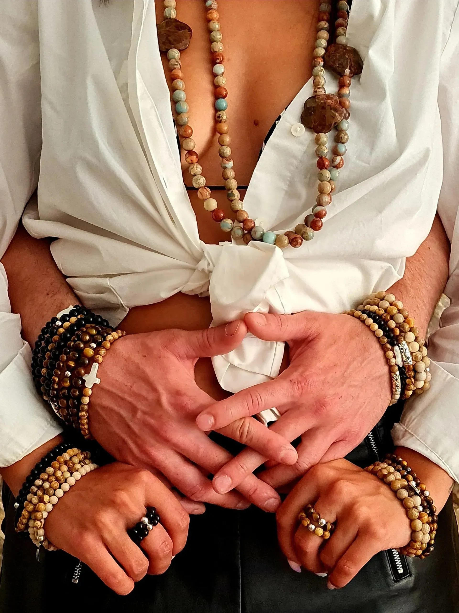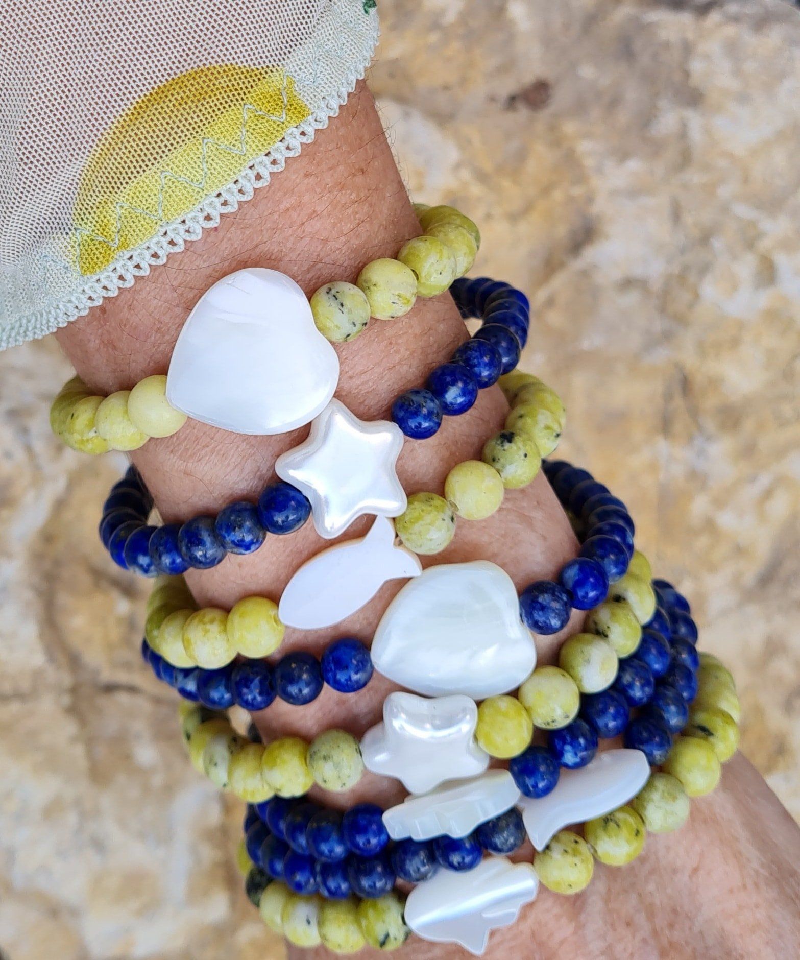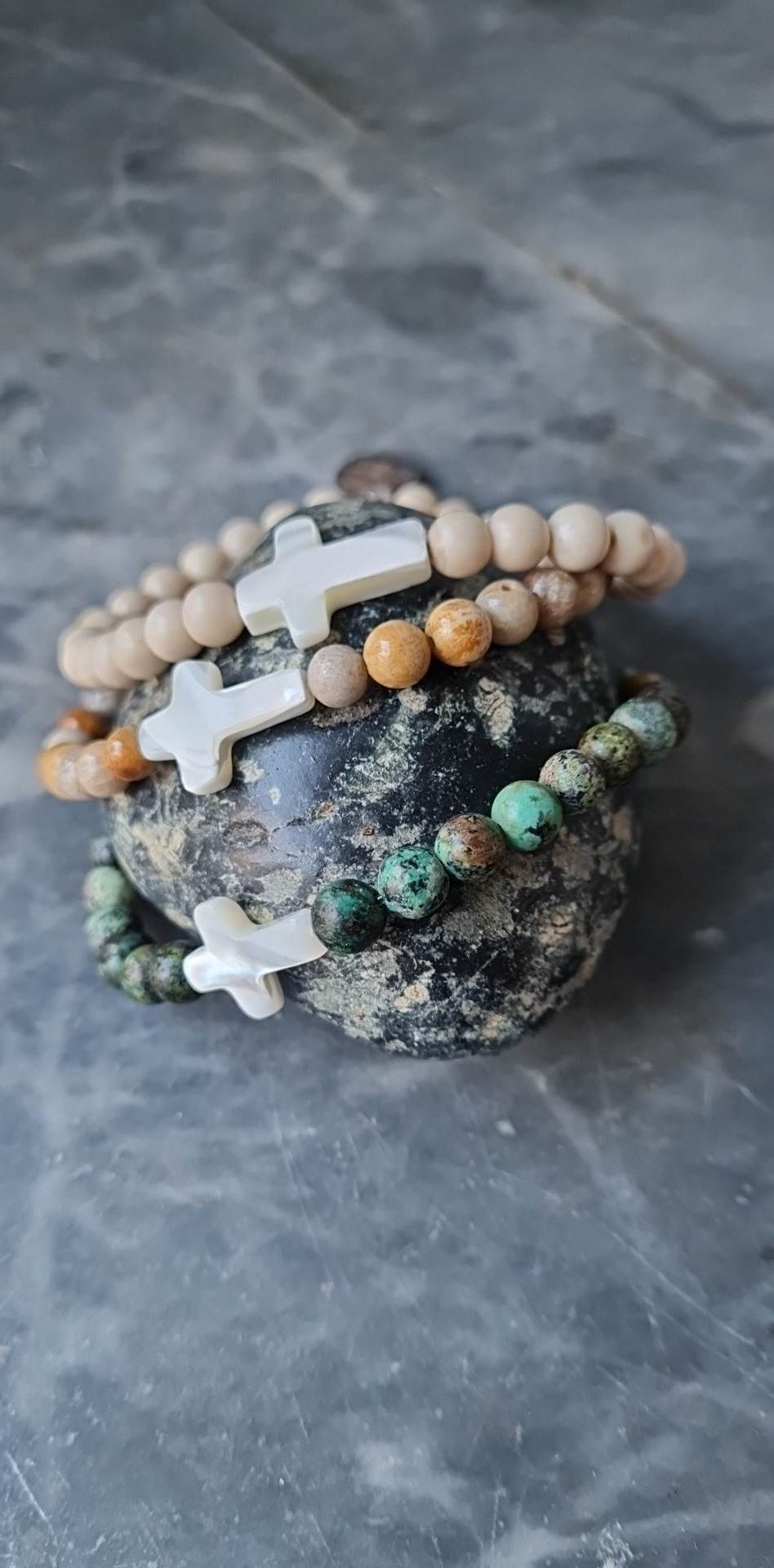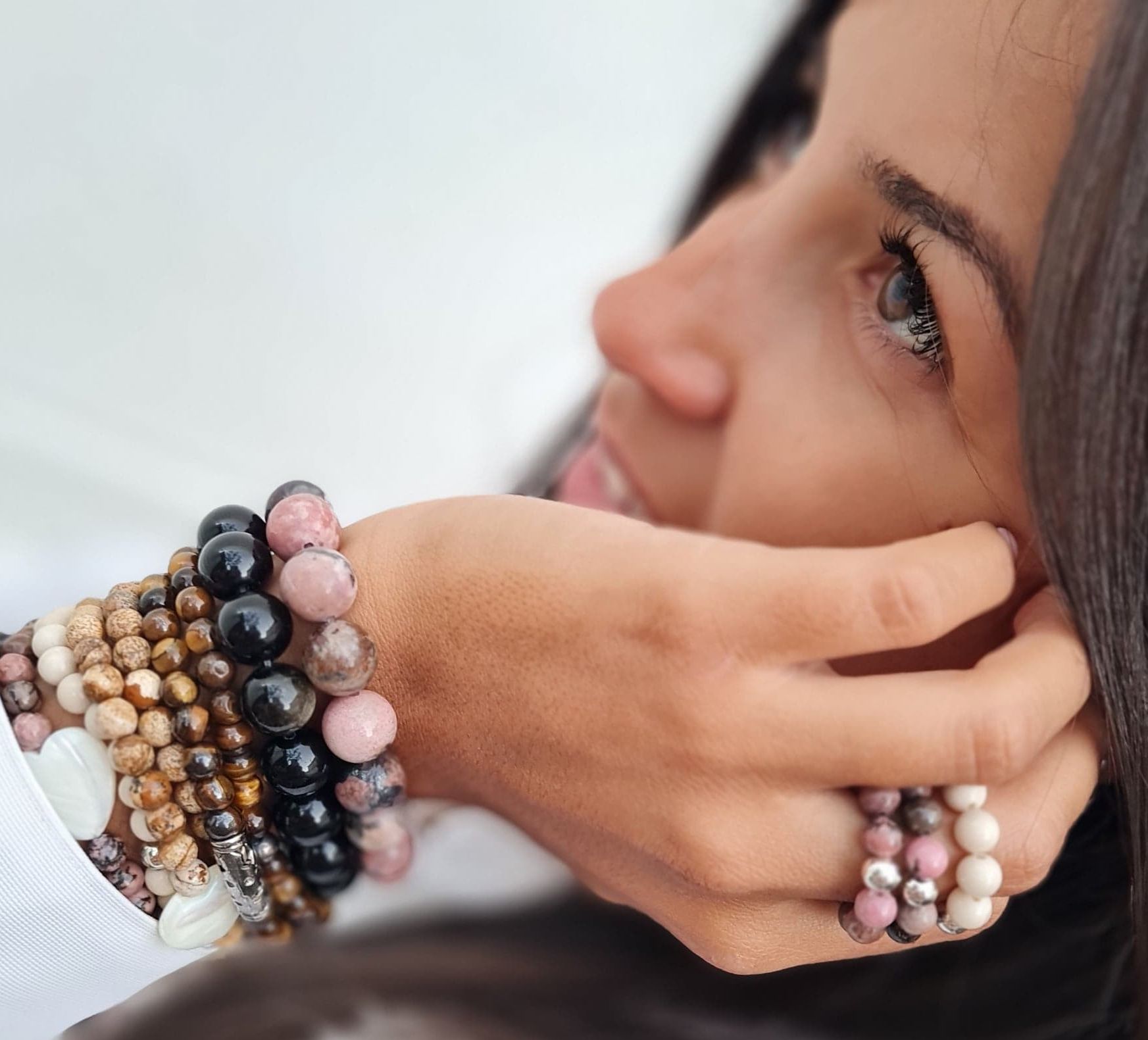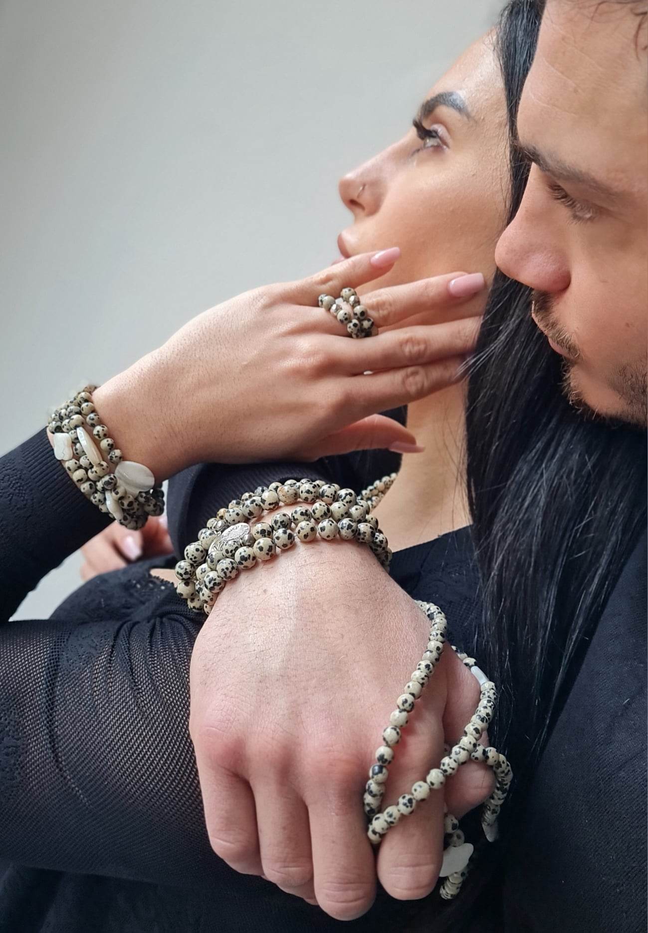 Bracelets avec un sujet confectionnés de pierres naturelles jaspe clair, turquoise bleu, agates noires, œil de Tigre, pierres fossile de rivière, jaspe dalmatien, turquoise verte d'Afrique, lapis-lazuli, turquoise jaune-noire, amazonite, jaspe d'été impérial, aventurine, obsidienne, rhodonite.