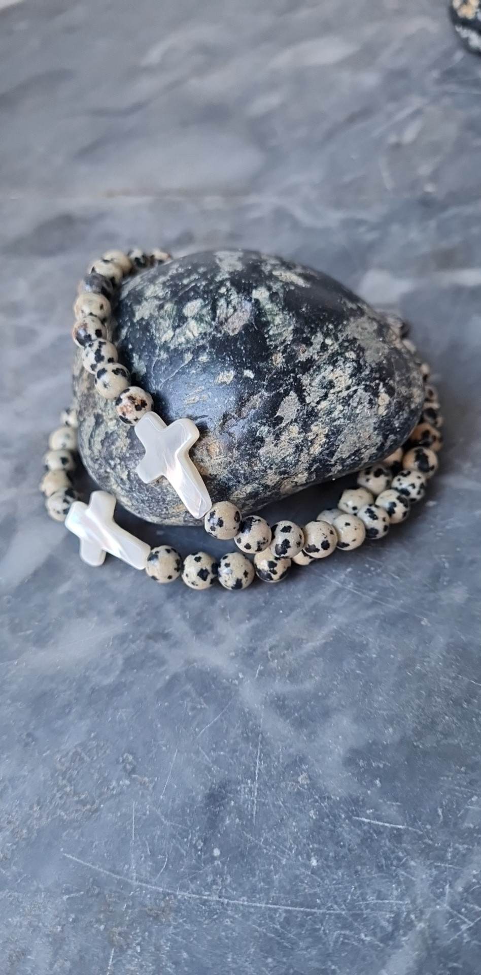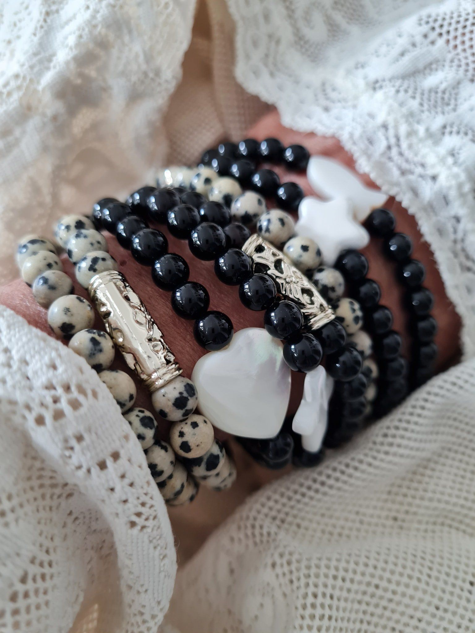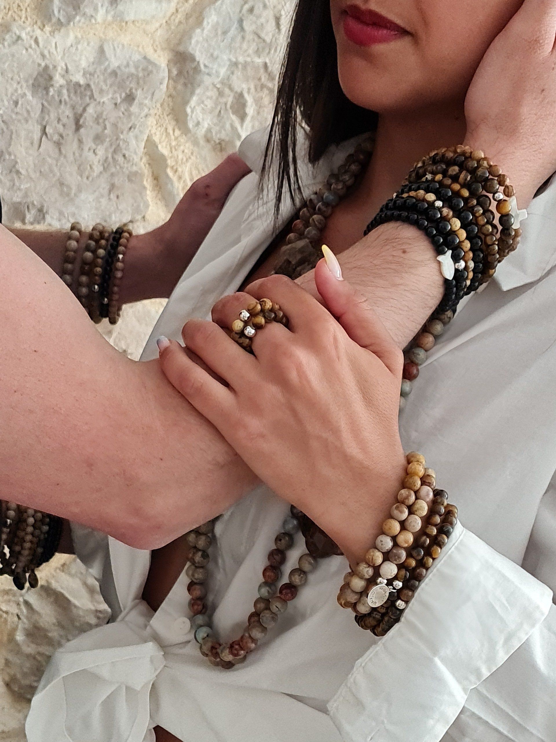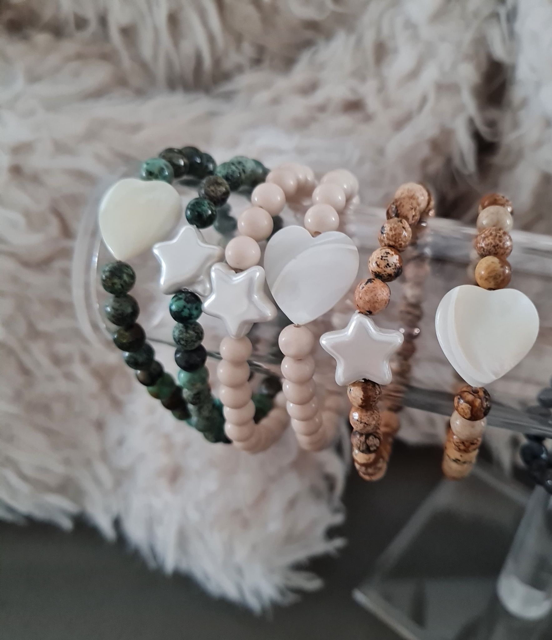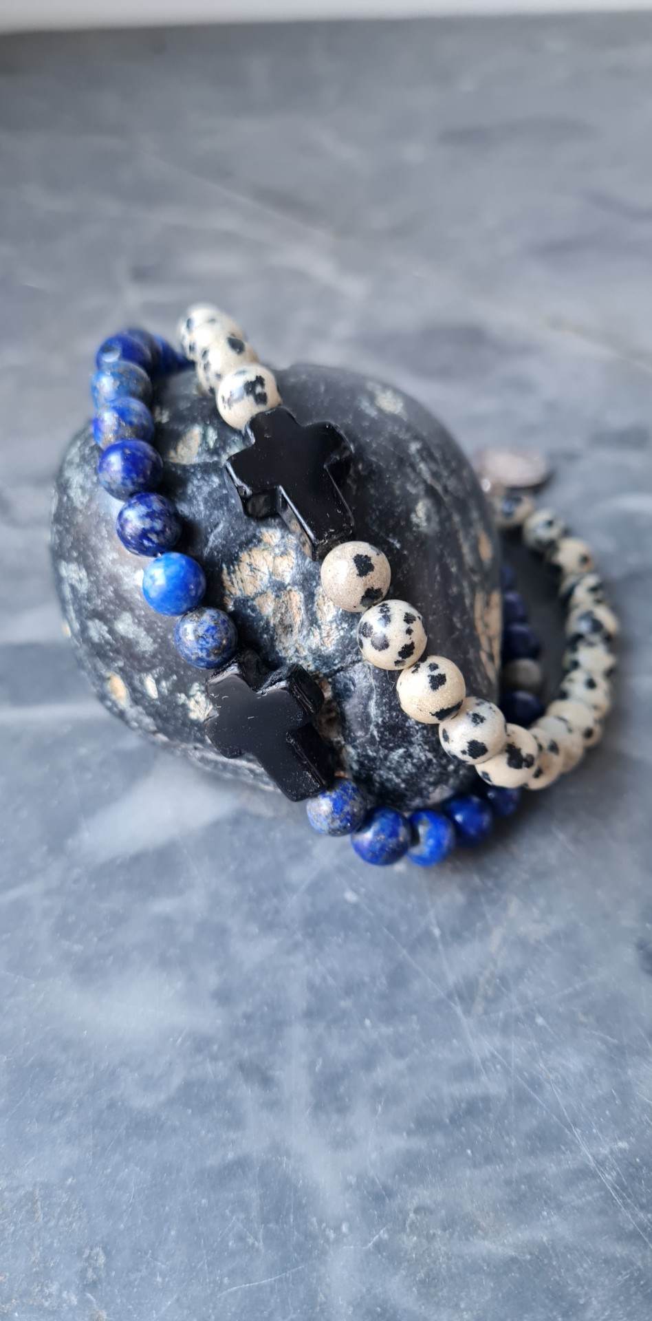 Bracelets avec un sujet confectionnés de pierres naturelles jaspe clair, turquoise bleu, agates noires, œil de Tigre, pierres fossile de rivière, jaspe dalmatien, turquoise verte d'Afrique, lapis-lazuli, turquoise jaune-noire, amazonite, jaspe d'été impérial, aventurine, obsidienne, rhodonite.