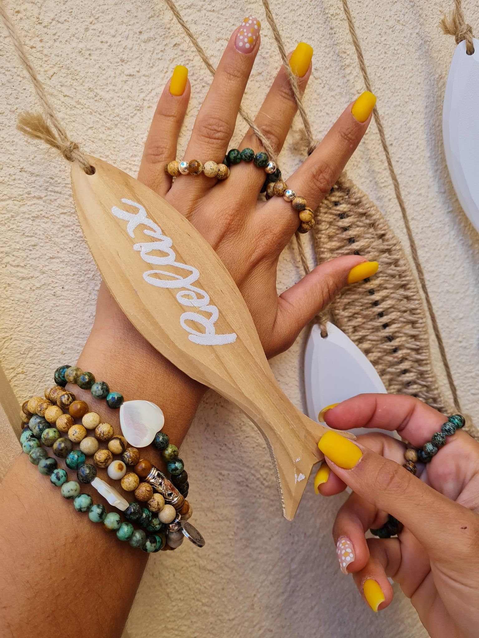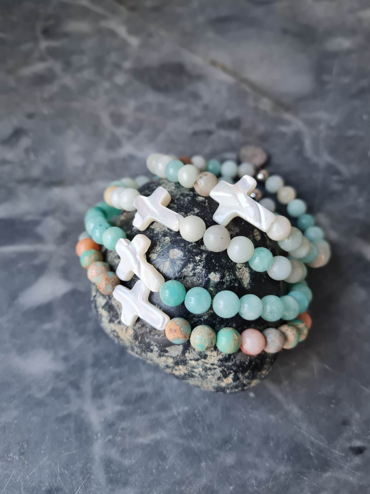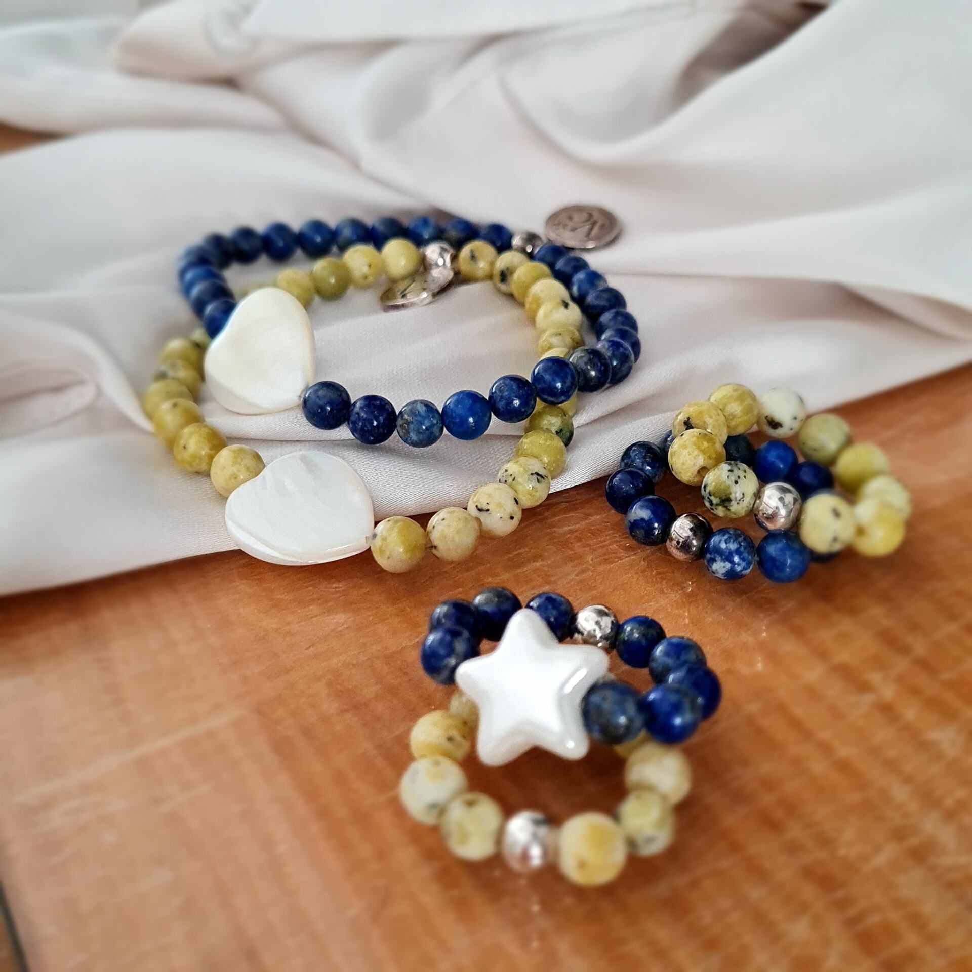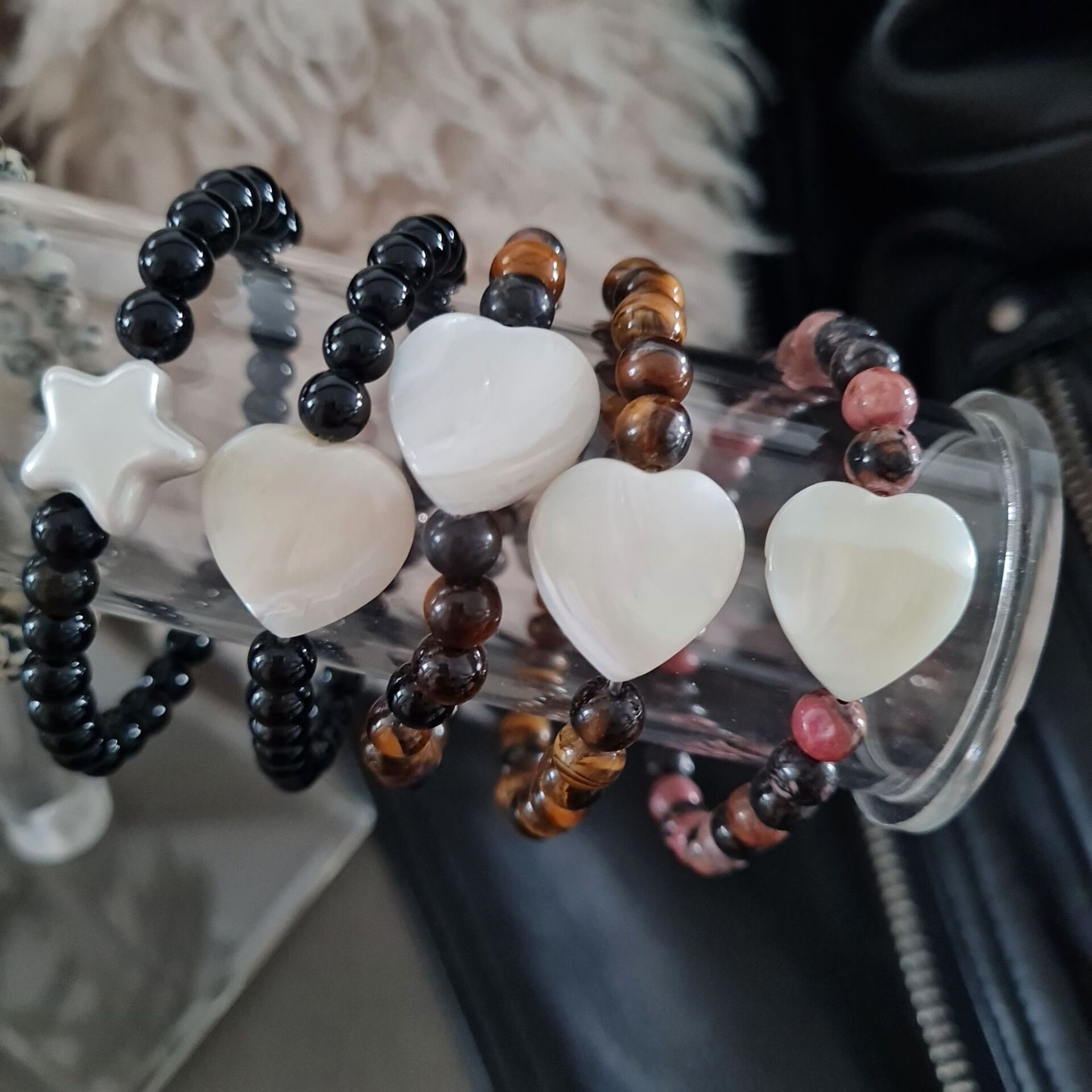 Bracelets avec un sujet confectionnés de pierres naturelles jaspe clair, turquoise bleu, agates noires, œil de Tigre, pierres fossile de rivière, jaspe dalmatien, turquoise verte d'Afrique, lapis-lazuli, turquoise jaune-noire, amazonite, jaspe d'été impérial, aventurine, obsidienne, rhodonite.