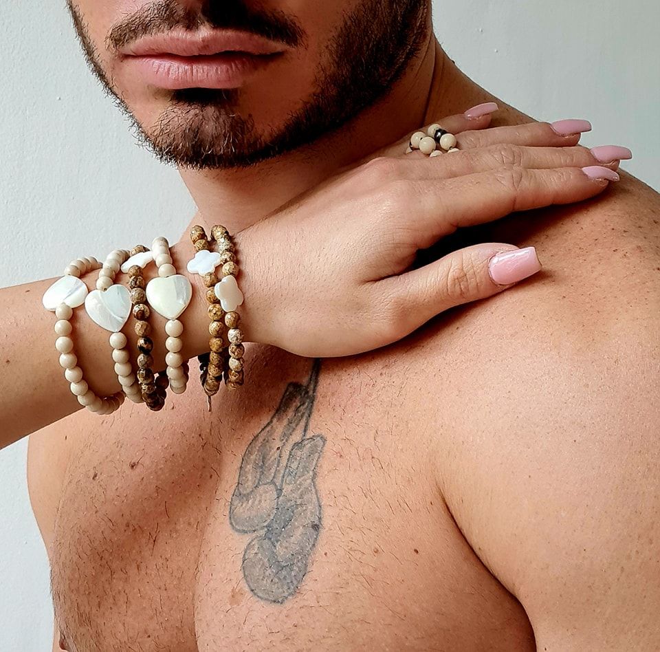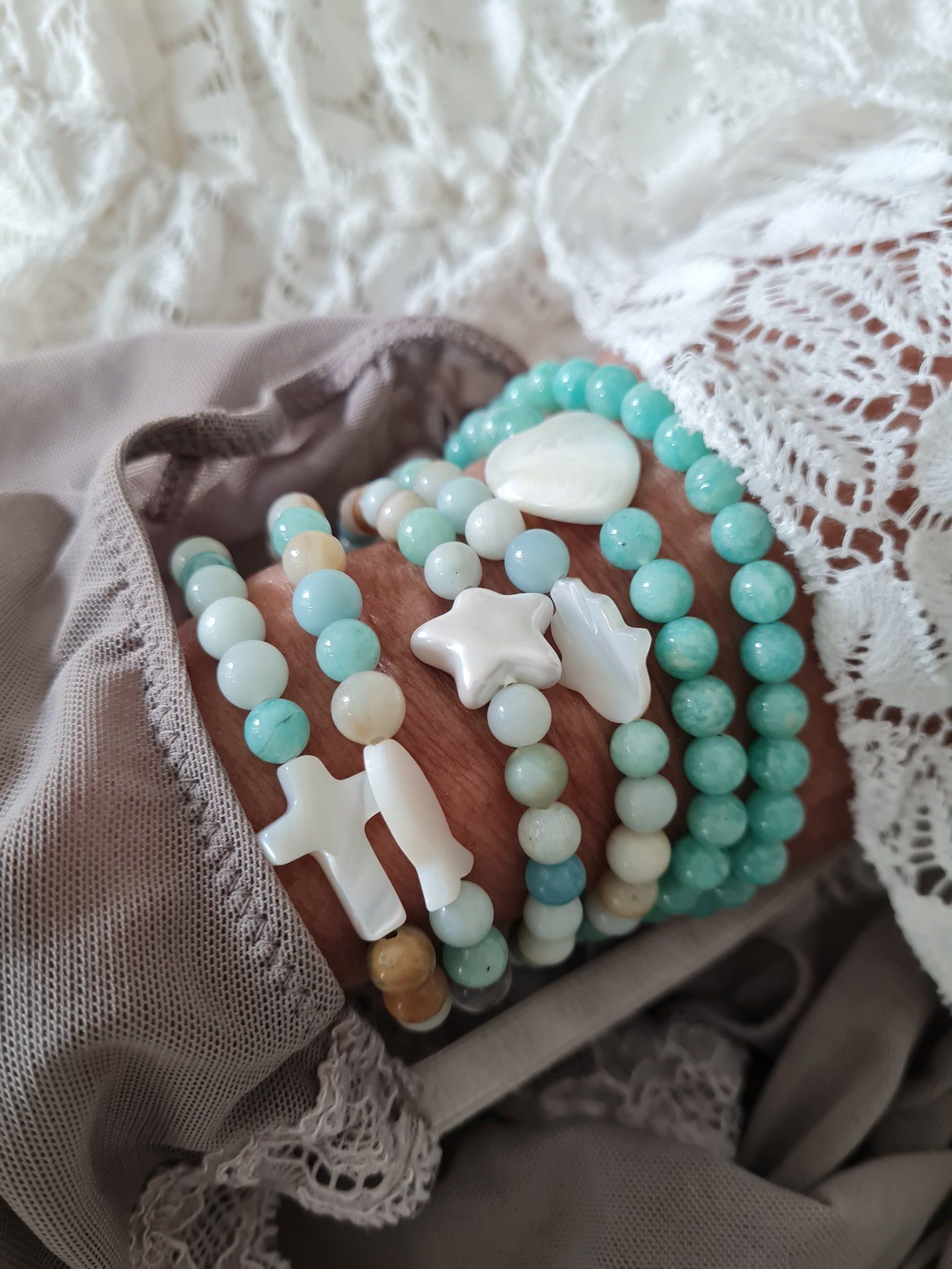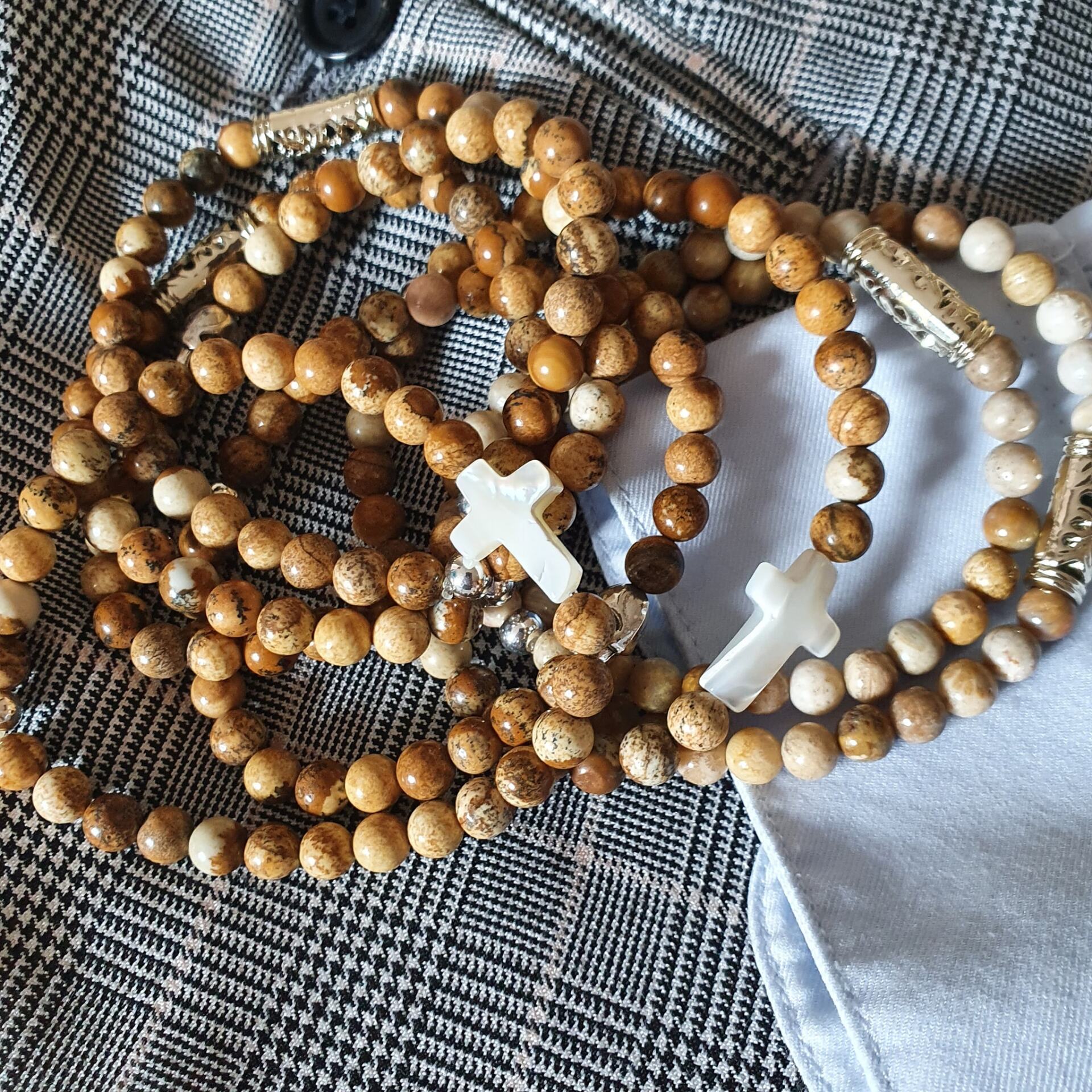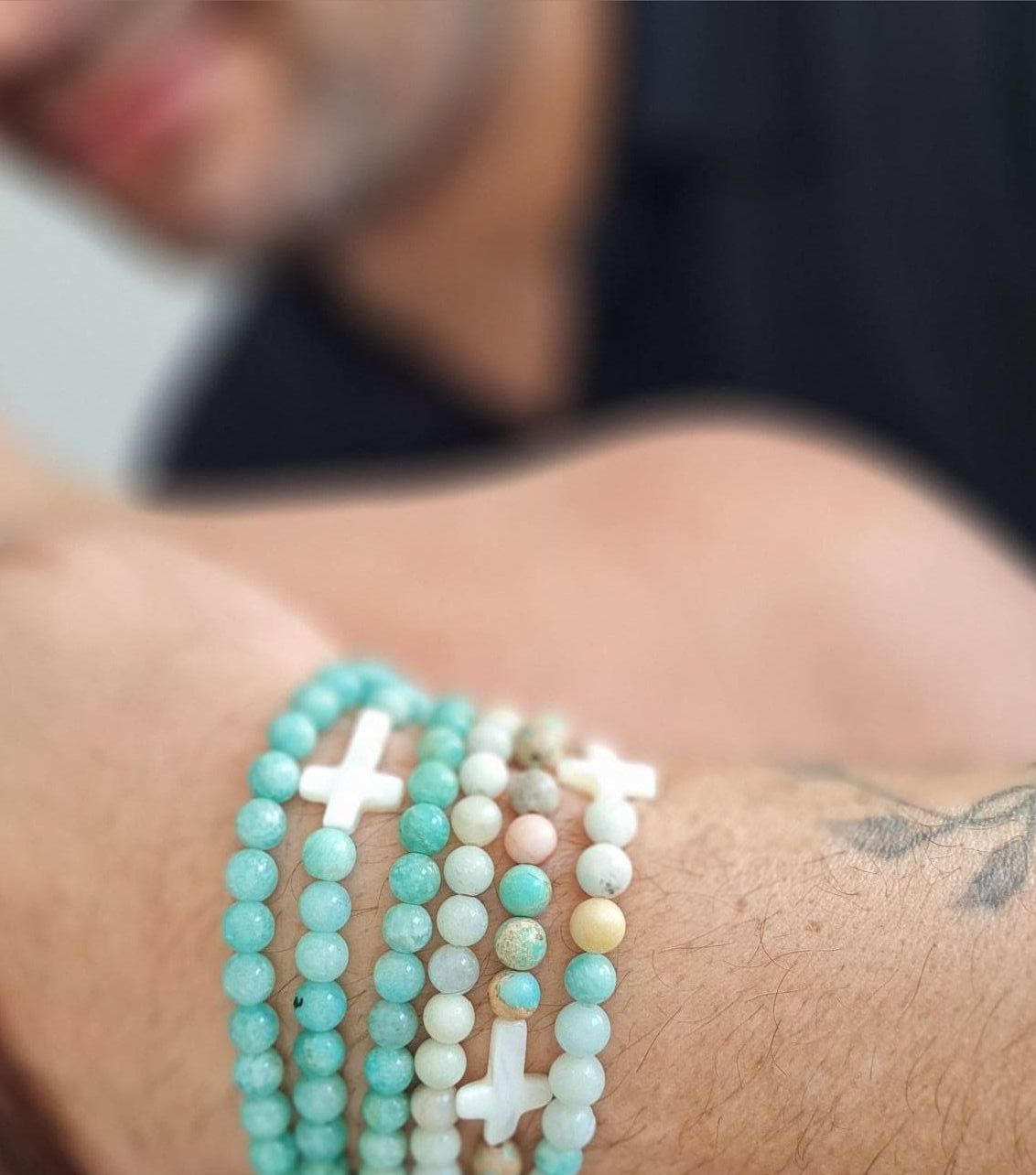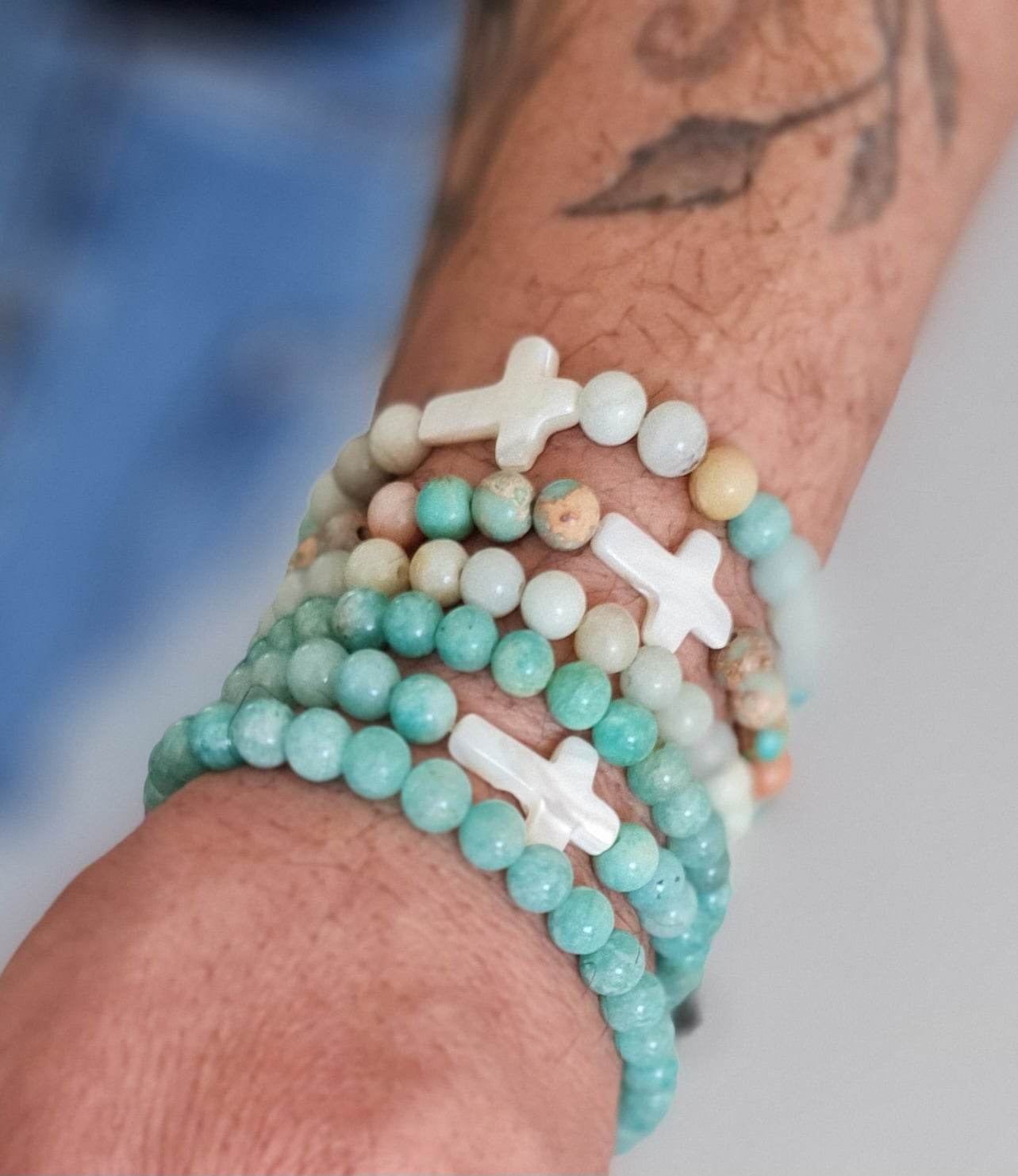 Bracelets avec un sujet confectionnés de pierres naturelles jaspe clair, turquoise bleu, agates noires, œil de Tigre, pierres fossile de rivière, jaspe dalmatien, turquoise verte d'Afrique, lapis-lazuli, turquoise jaune-noire, amazonite, jaspe d'été impérial, aventurine, obsidienne, rhodonite.