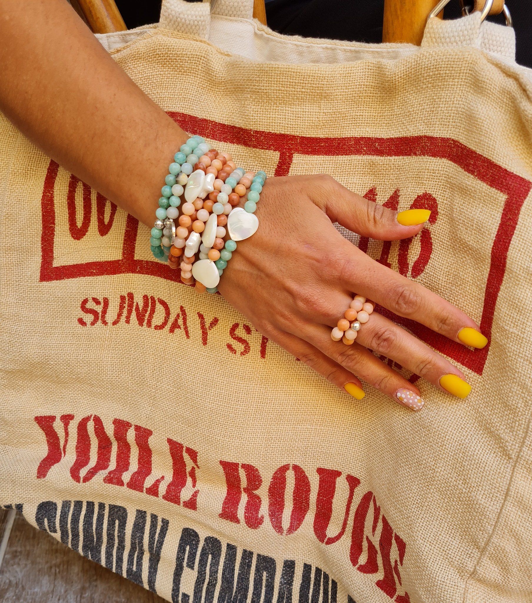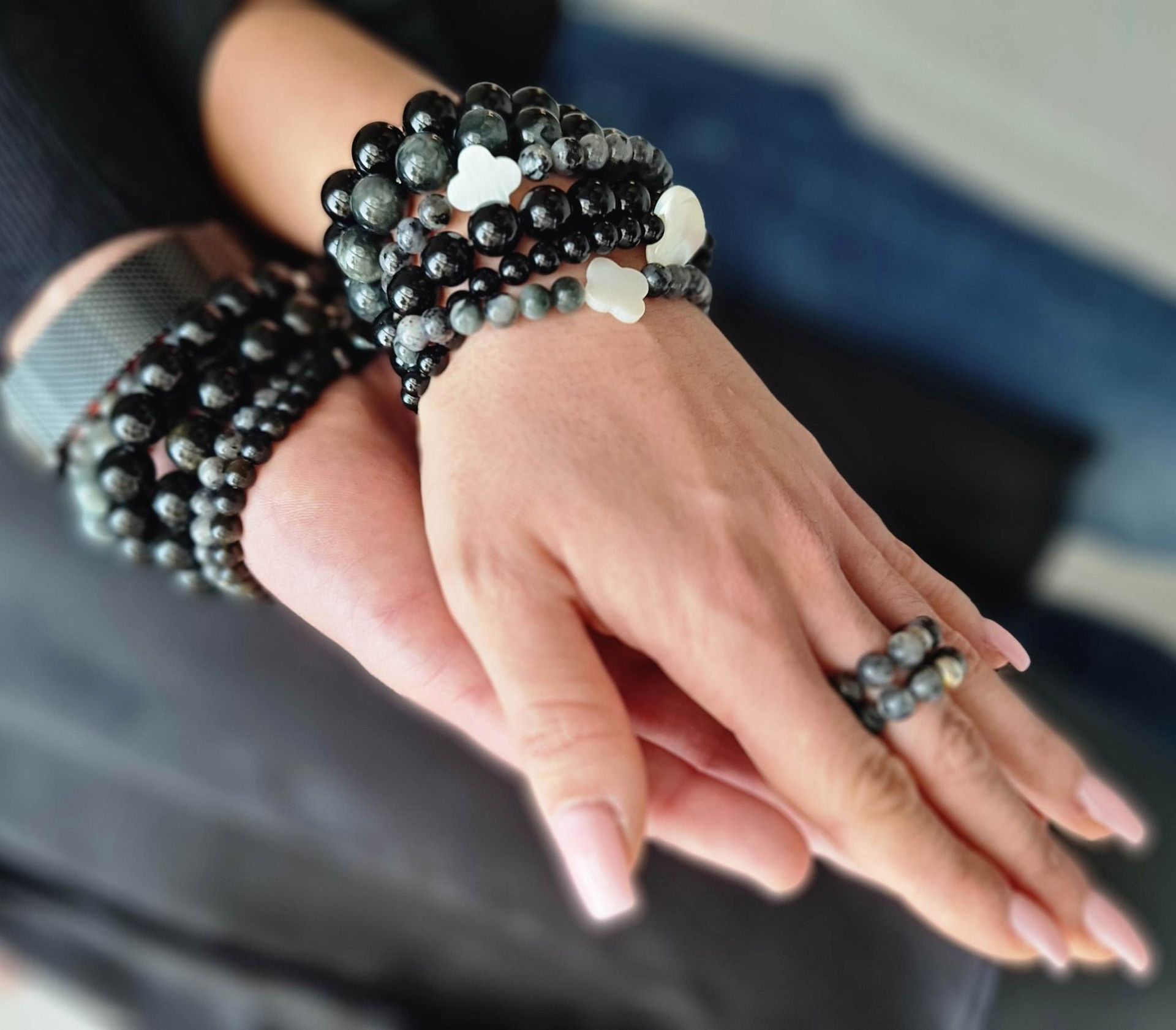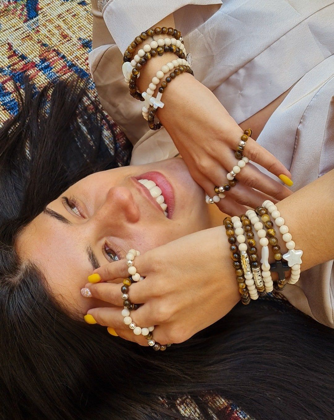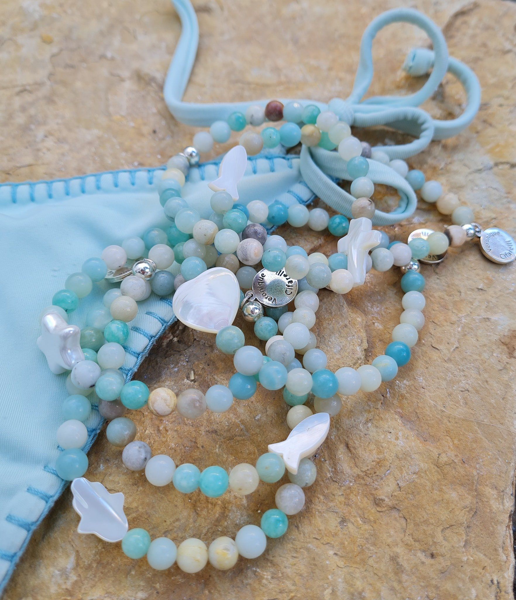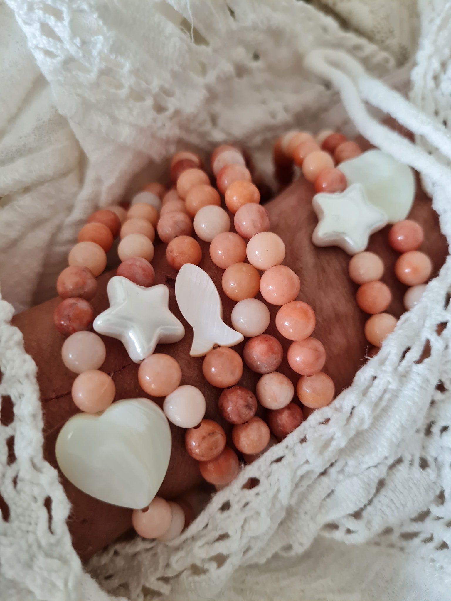 Bracelets avec un sujet confectionnés de pierres naturelles jaspe clair, turquoise bleu, agates noires, œil de Tigre, pierres fossile de rivière, jaspe dalmatien, turquoise verte d'Afrique, lapis-lazuli, turquoise jaune-noire, amazonite, jaspe d'été impérial, aventurine, obsidienne, rhodonite.