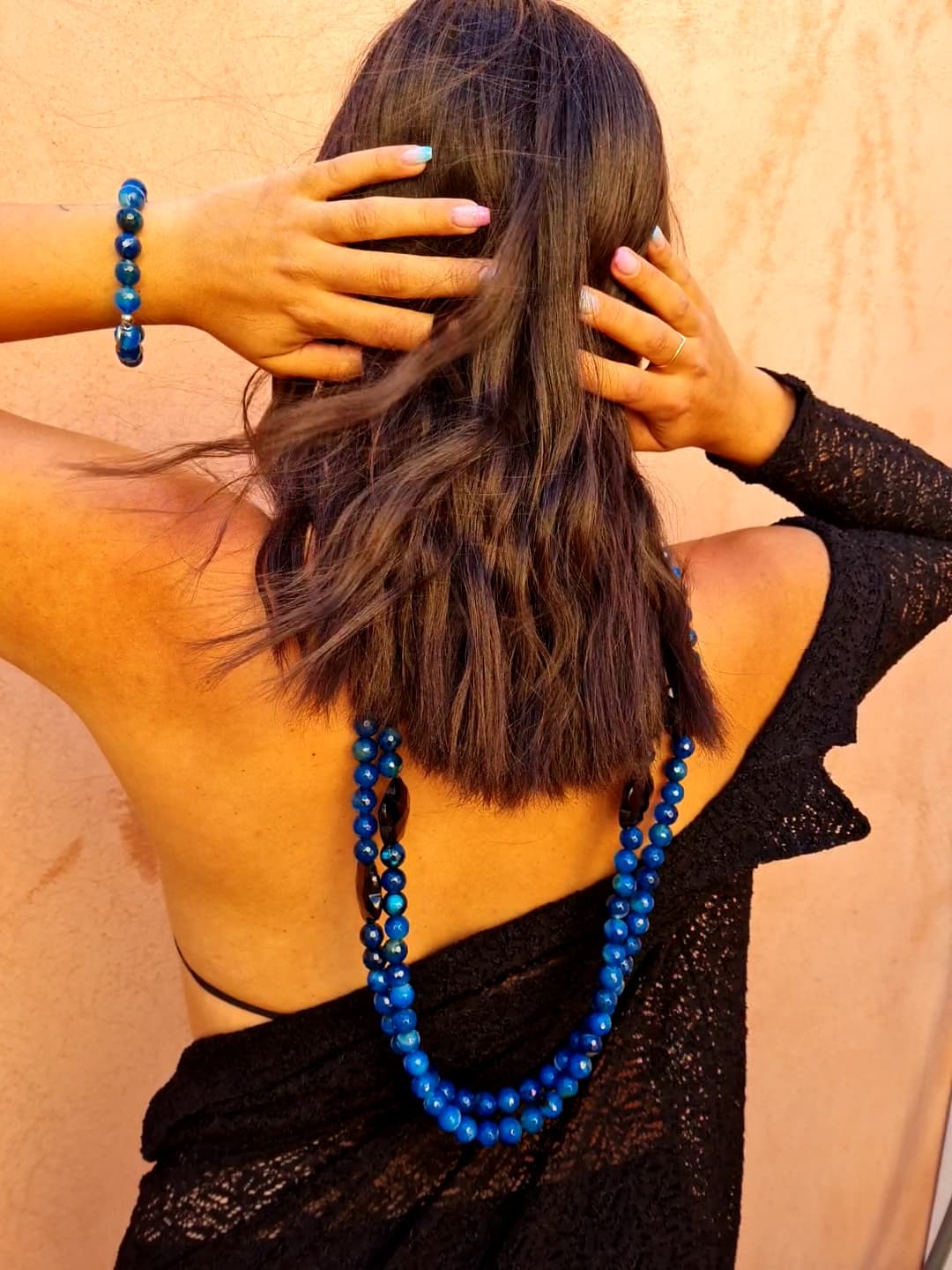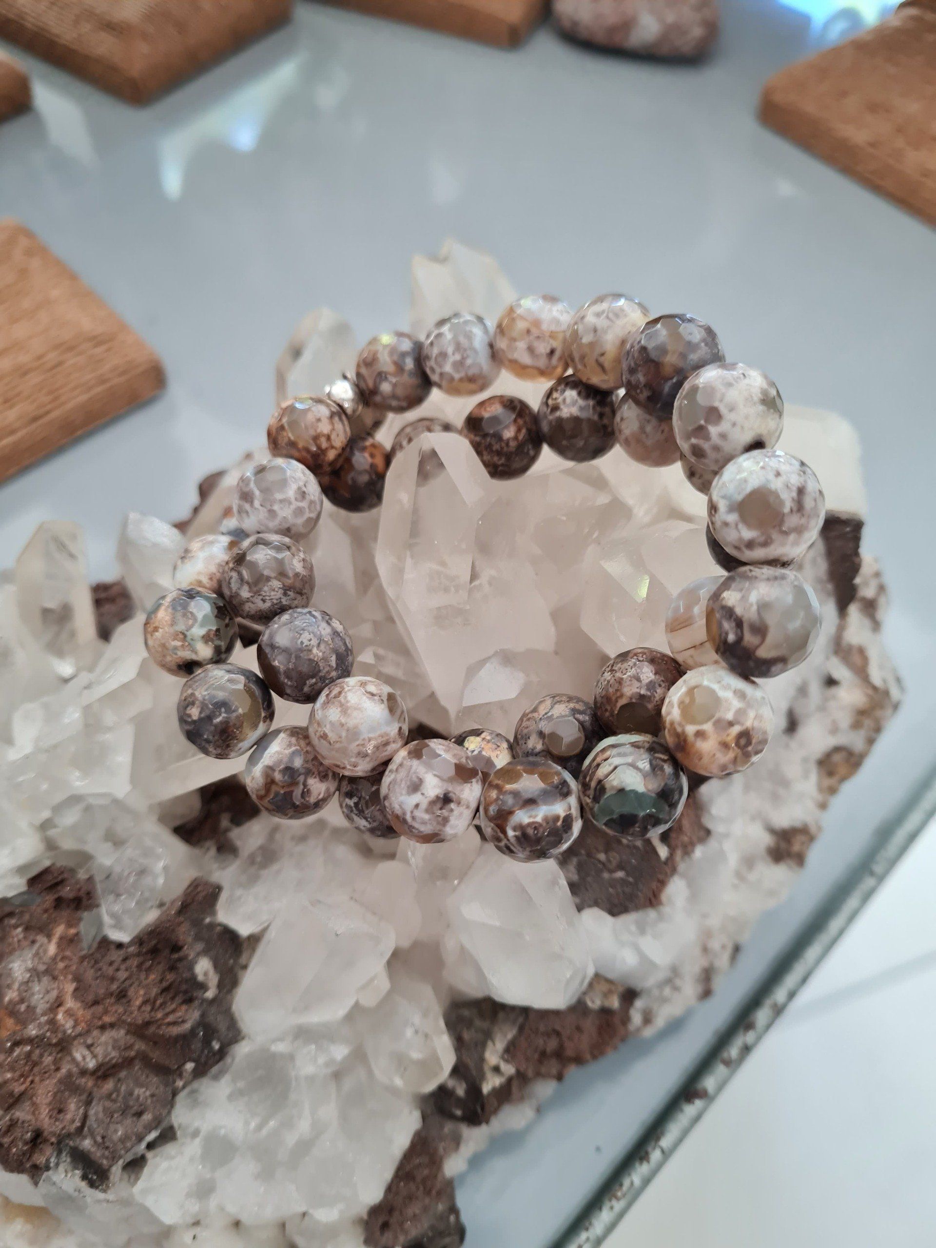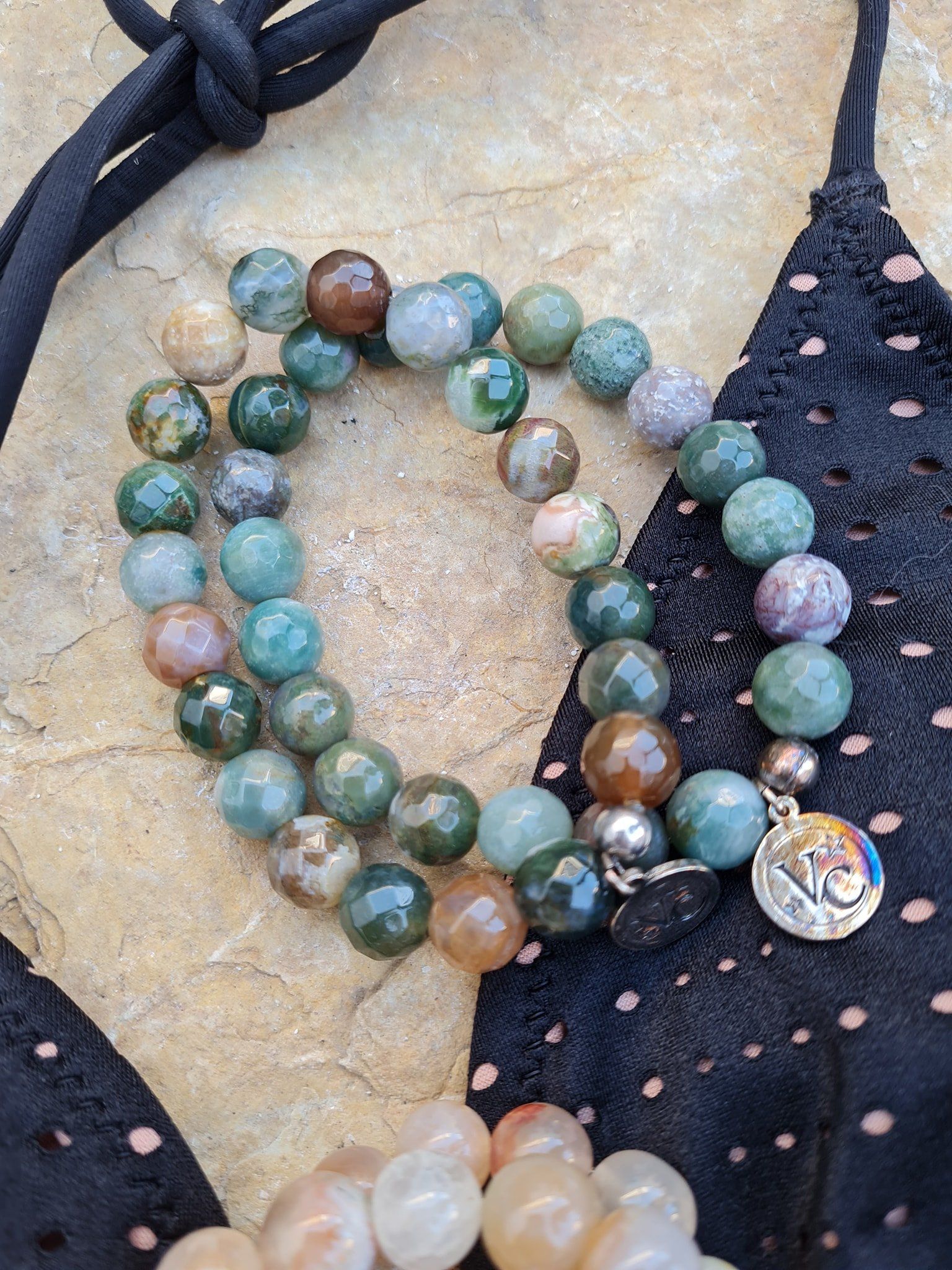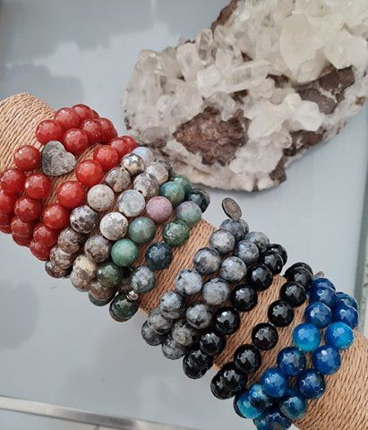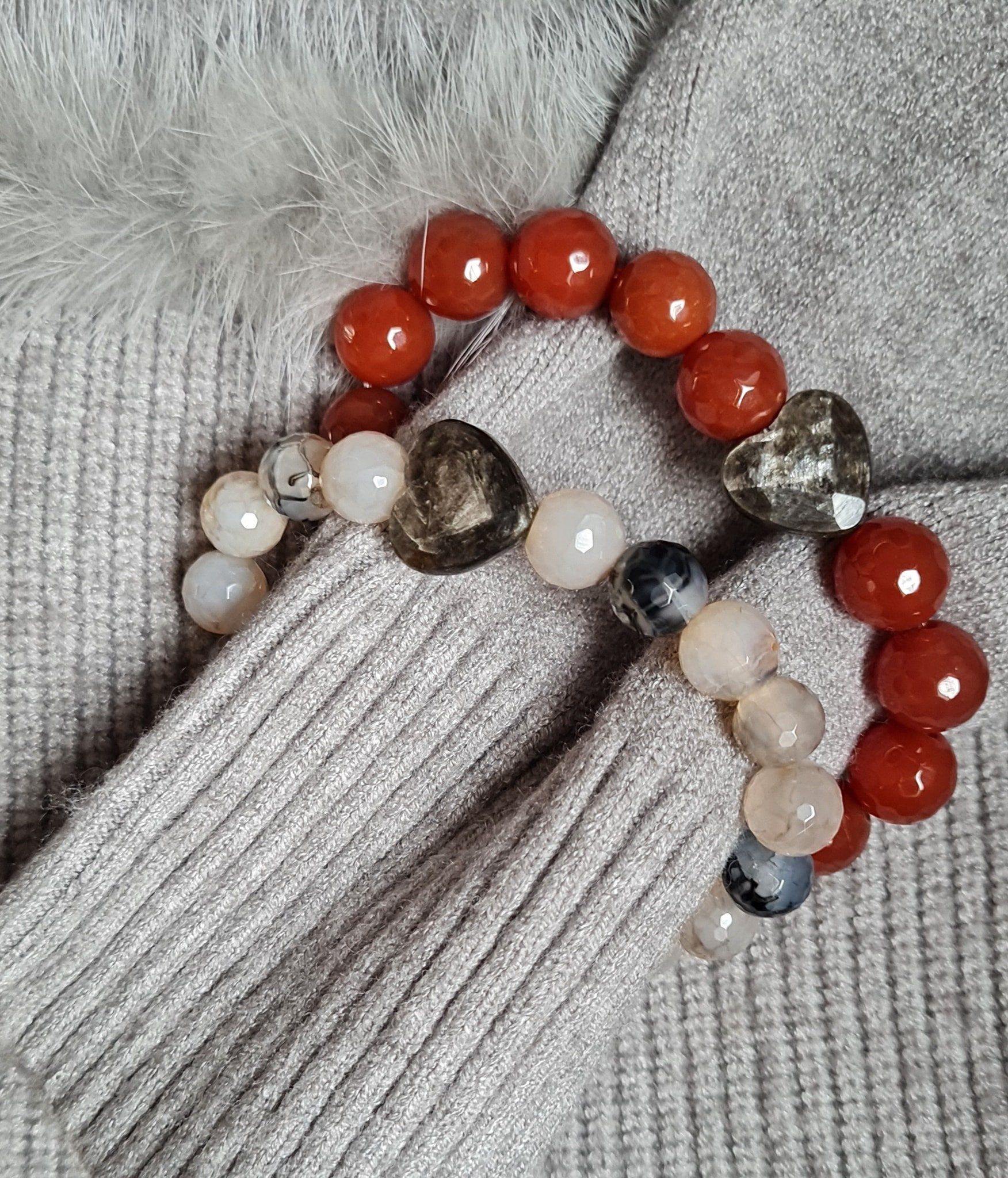 Bracelets confectionnés de pierres naturelles facettées. Agates de couleur, bleu nuit, vert crème, vert d'eau, orangé-noir, rouge orangé. Taille de la boule 12mm & 10mm.