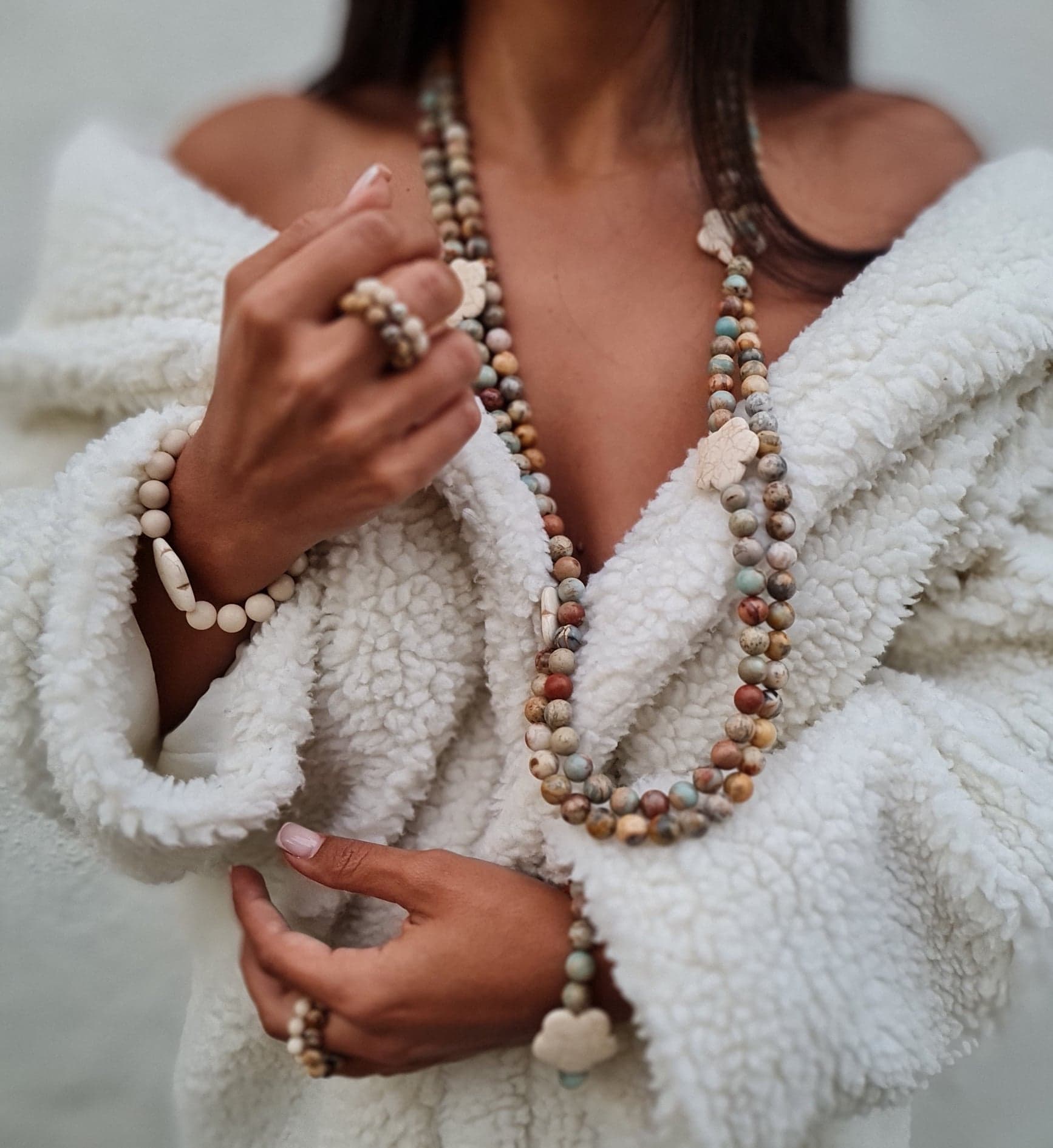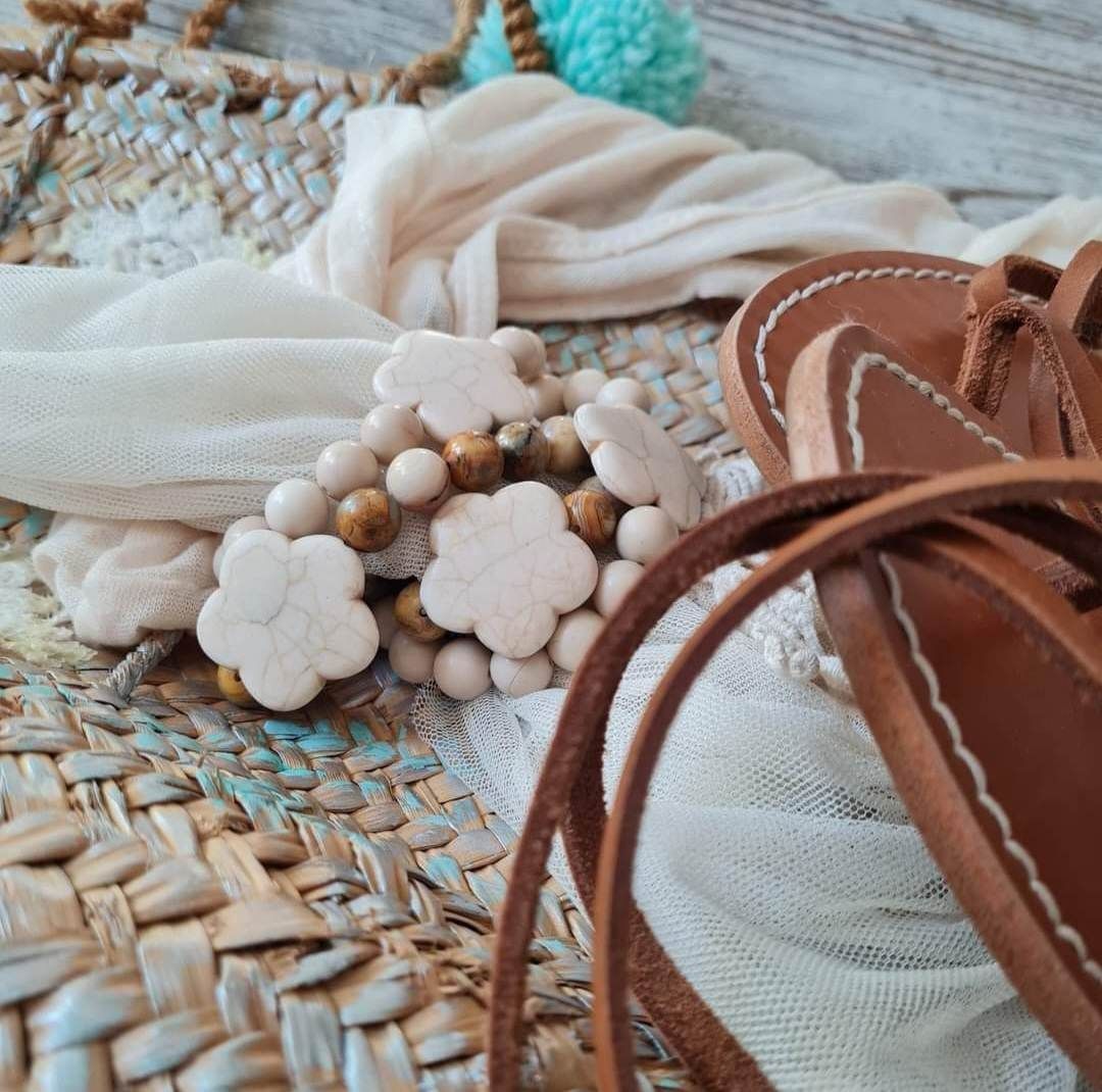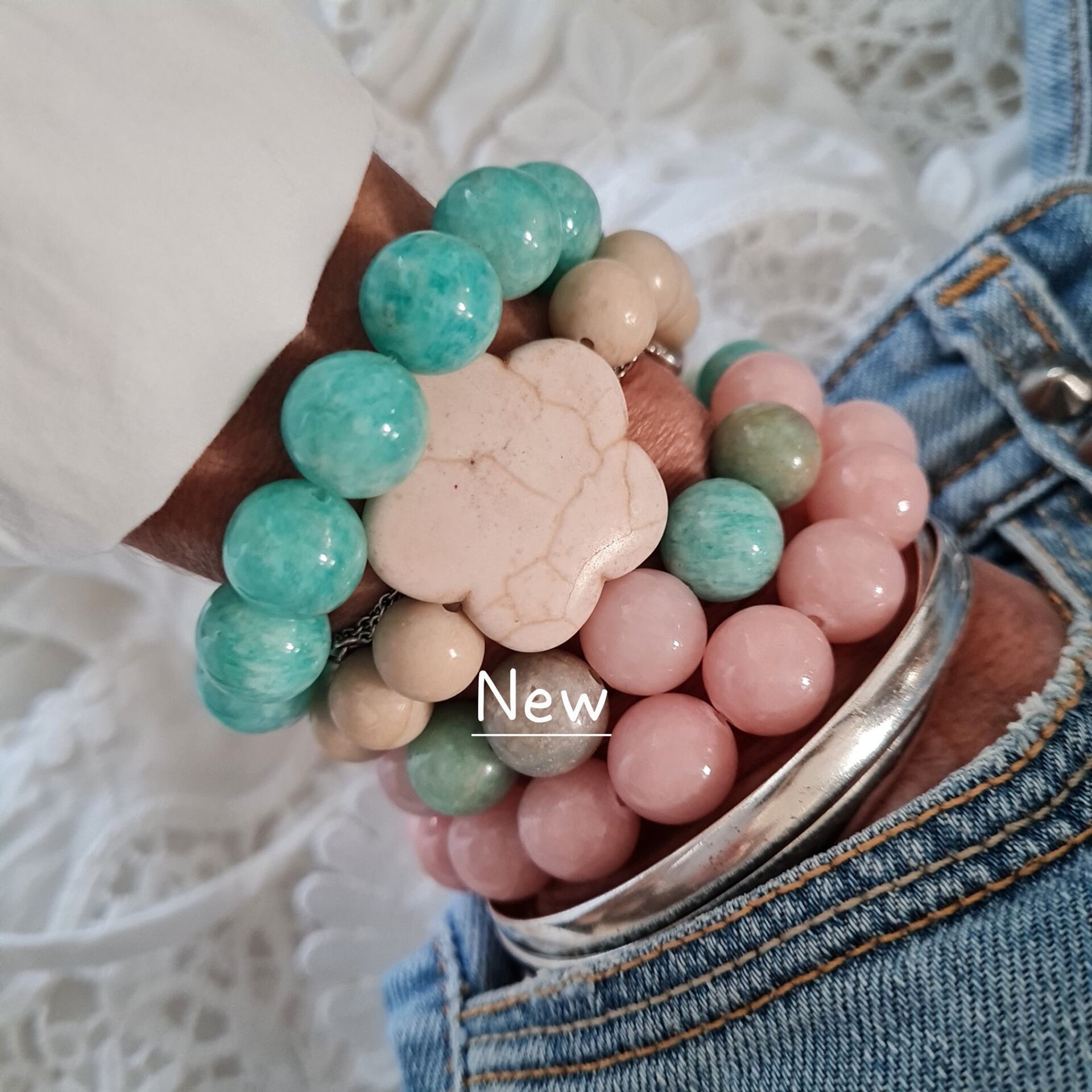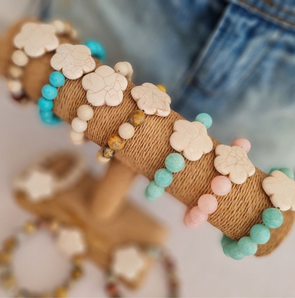 Bracelets parures assortis aux sautoirs "BRUNELLA "GIRLY" . Bracelets confectionnés de pierres naturelles avec sa fleur.