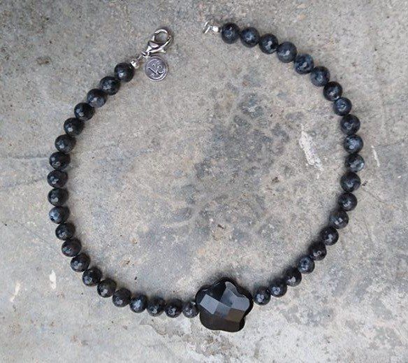 Ras de cou confectionné de pierres facettées avec une fleur d'agate noire facettée.