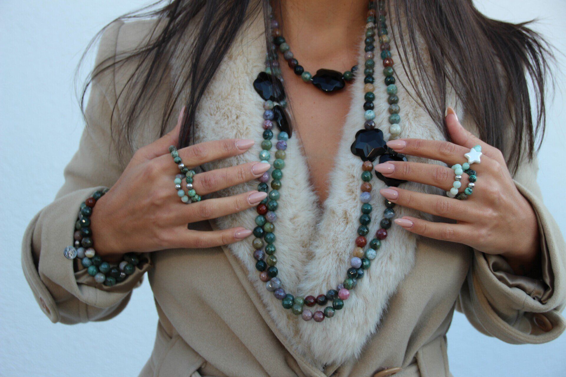 Couleurs et pierres : Agates verte, crème, violette, marron.