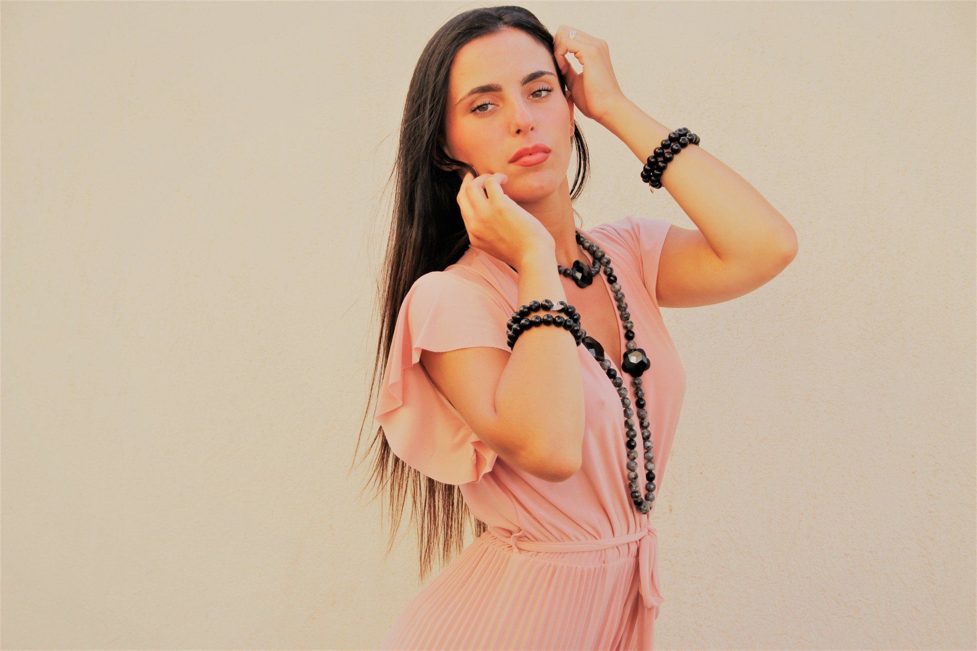 sur la photo de gauche le ras de cou est proposé avec 2 sautoirs de la collection Brunella facettée.