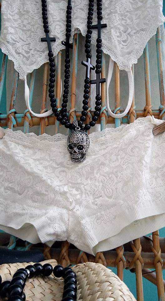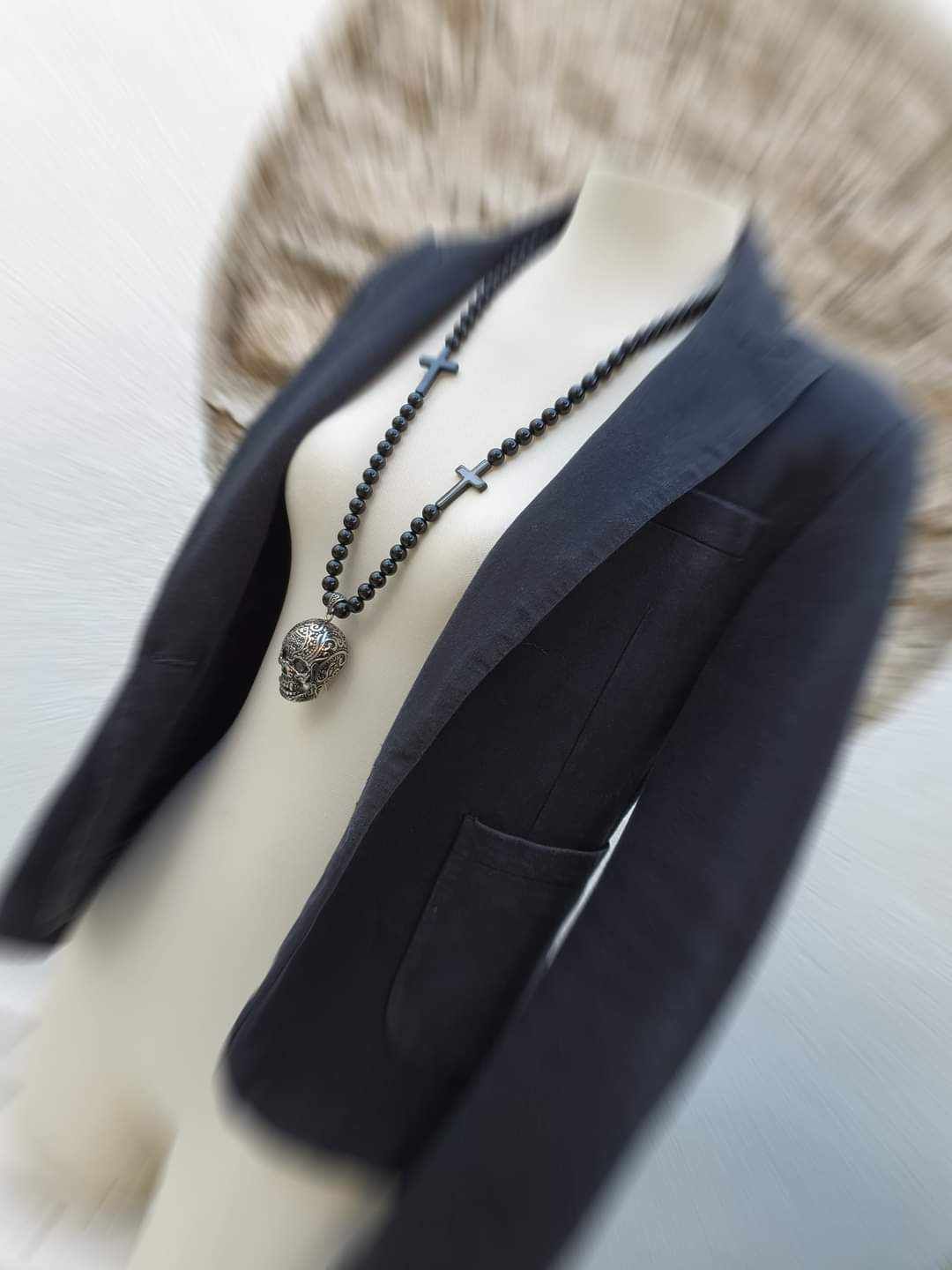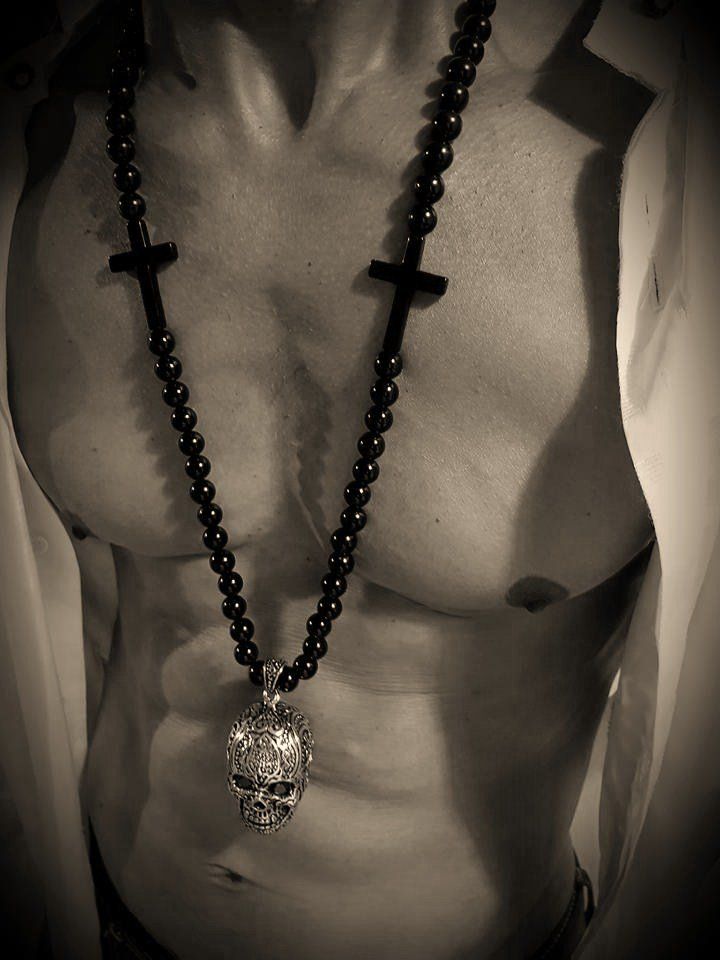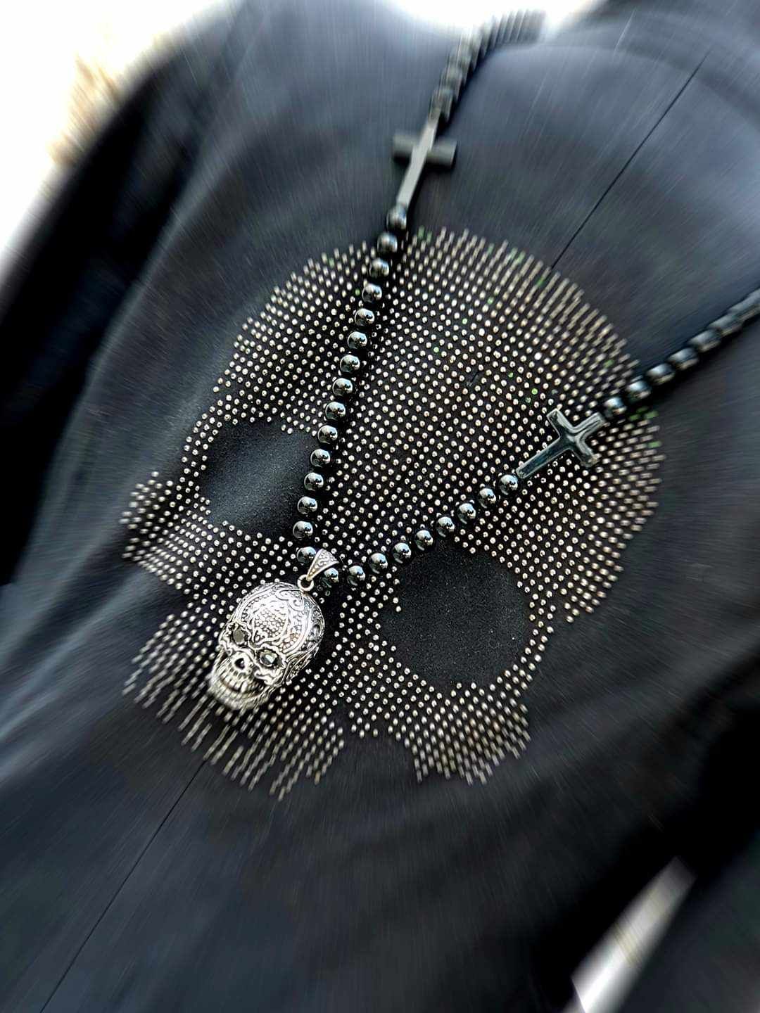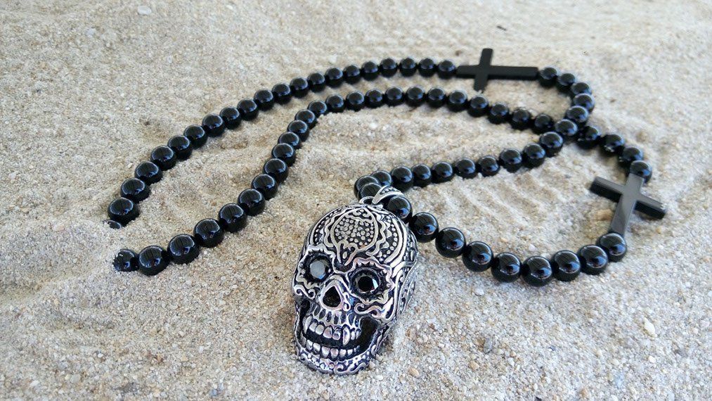 Sautoir confectionné de pierres naturelles, agates noires. 2 croix d’onyx noires et 1 tête de mort.