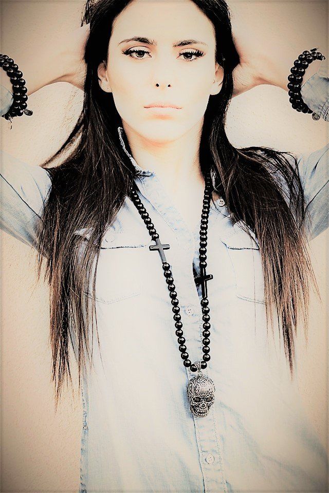Sautoir confectionné de pierres naturelles, agates noires. 2 croix d’onyx sans tête de mort.