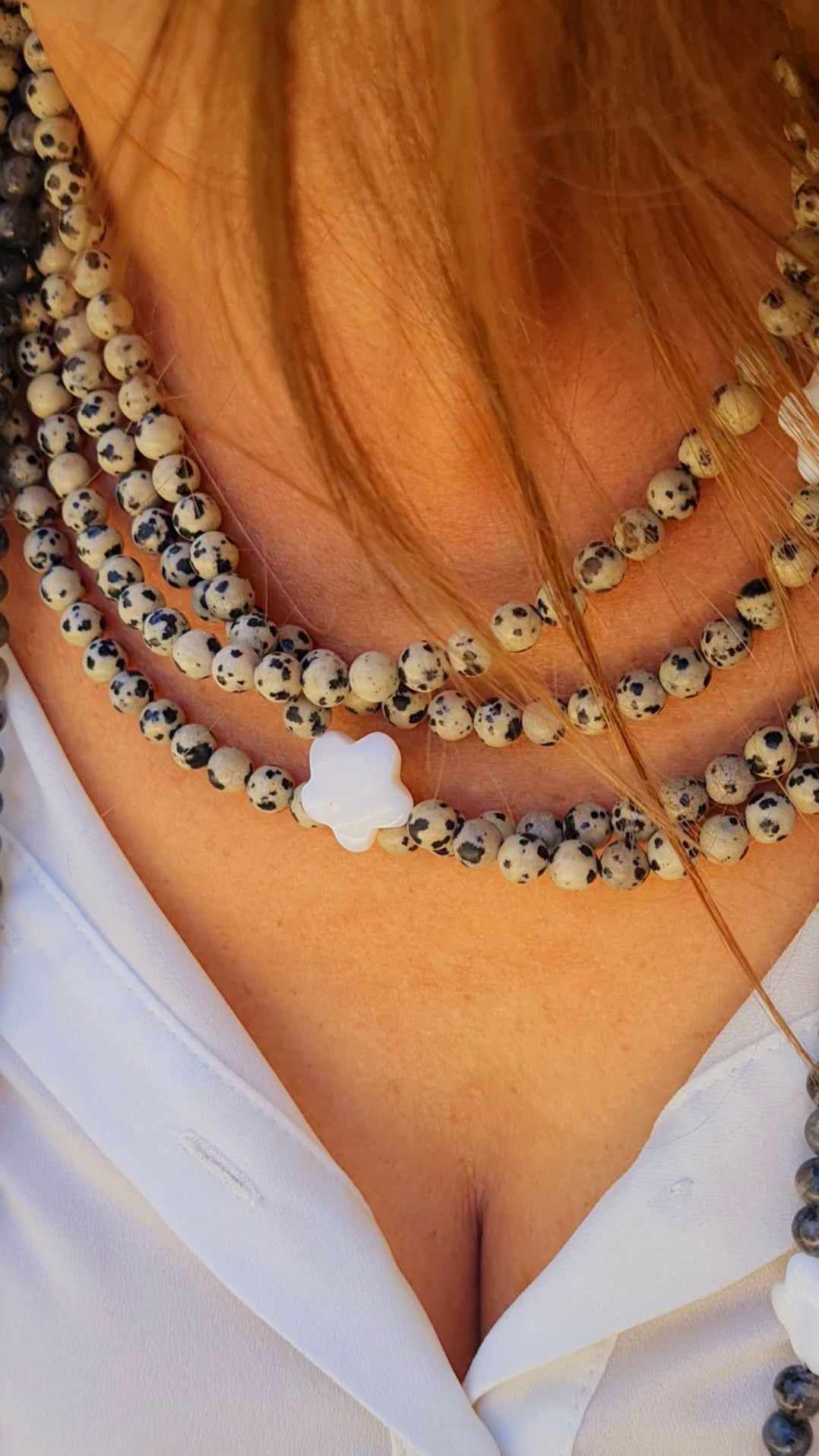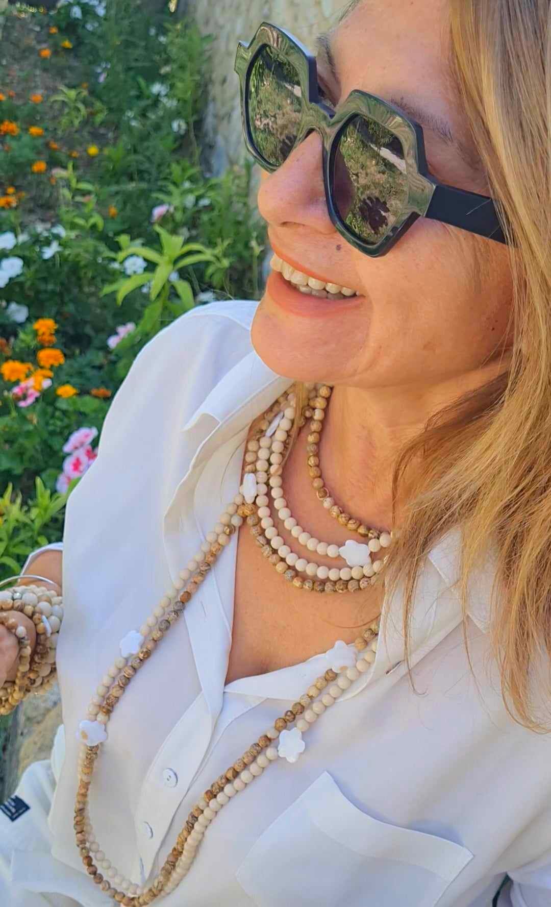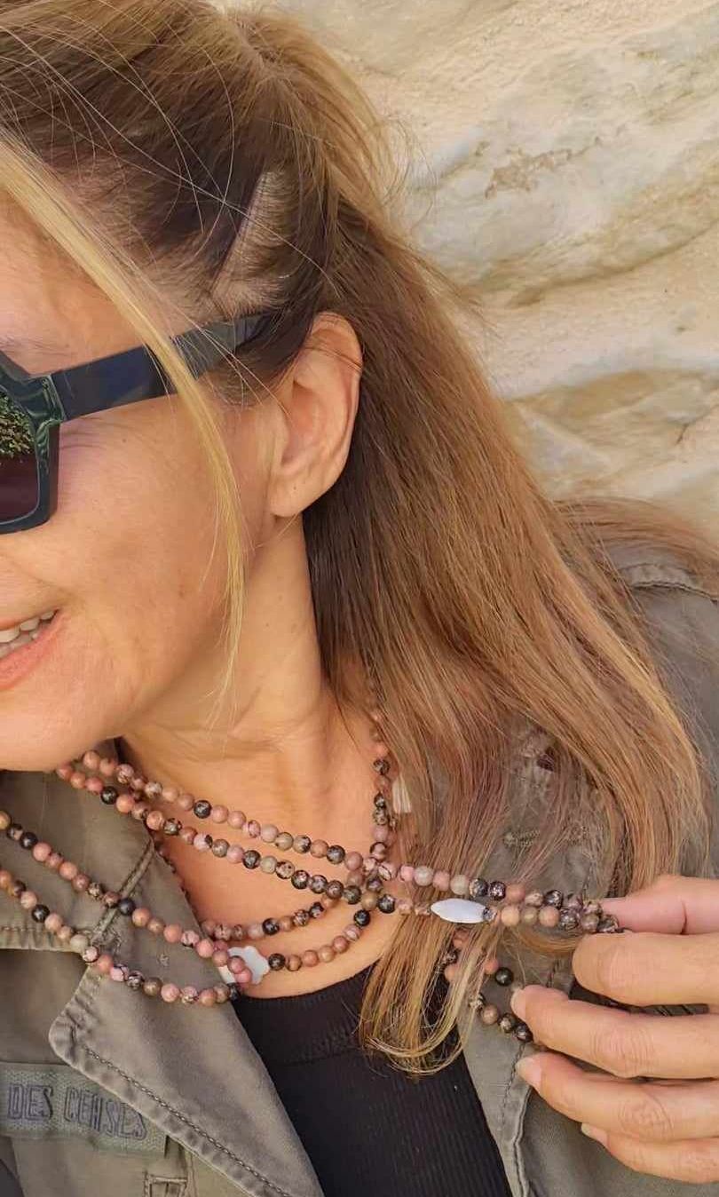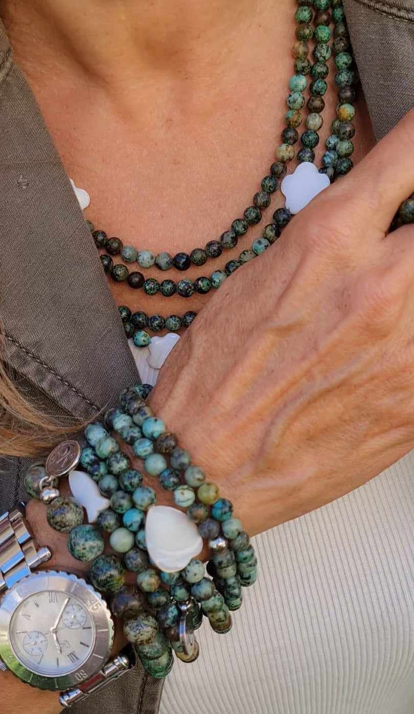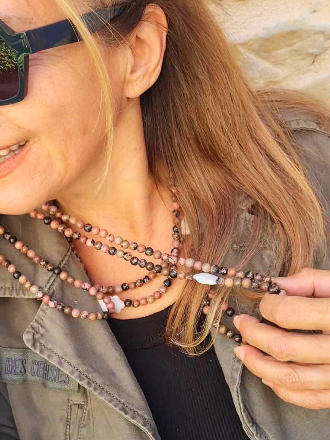 Long sautoir porté simplement ou en 2 tours ras de cou confectionné de pierres naturelles avec ses deux fleurs de nacre. Taille de la boule 6mm.