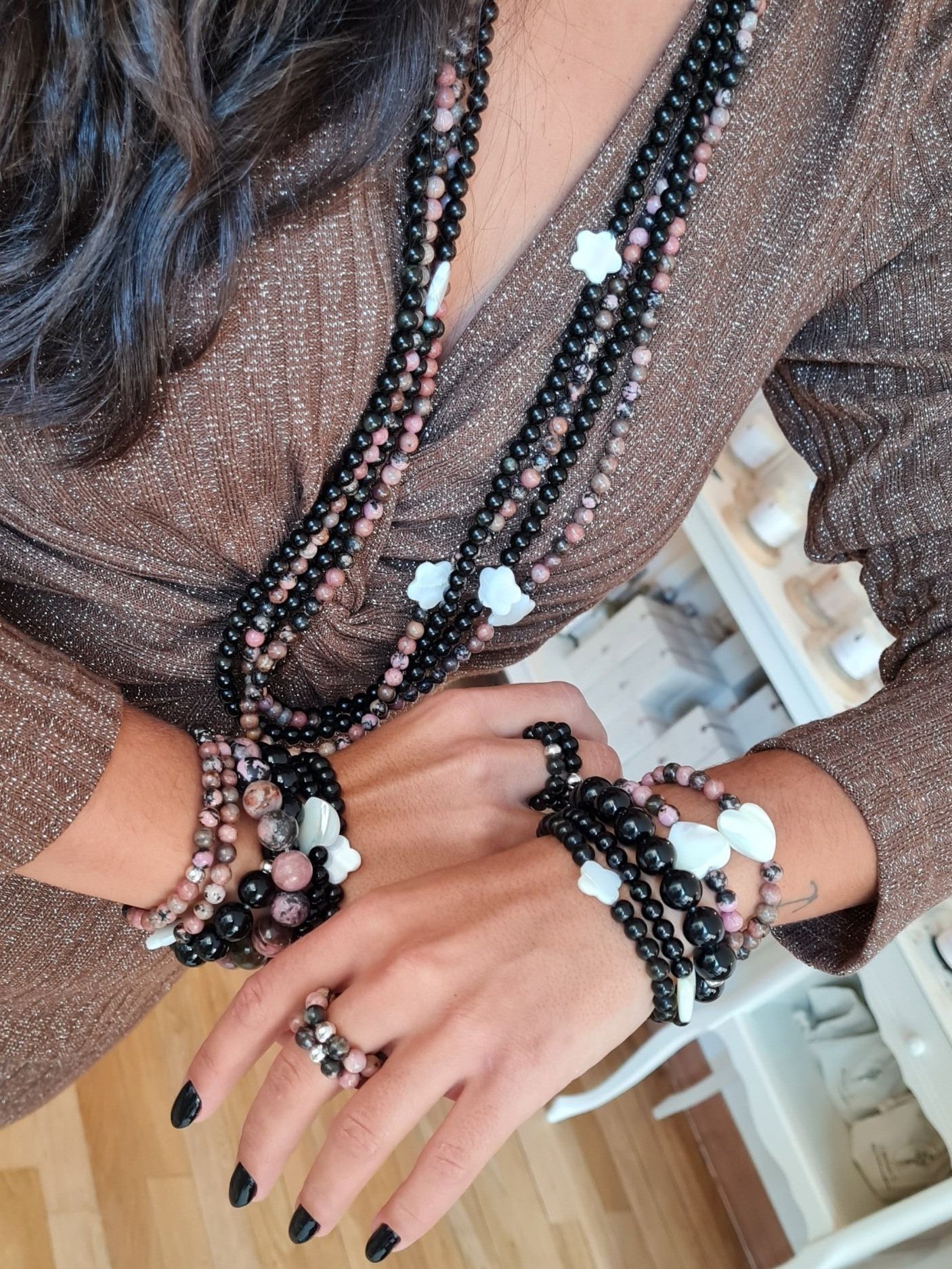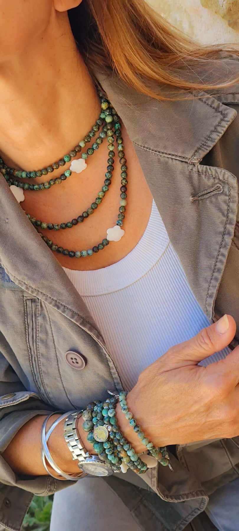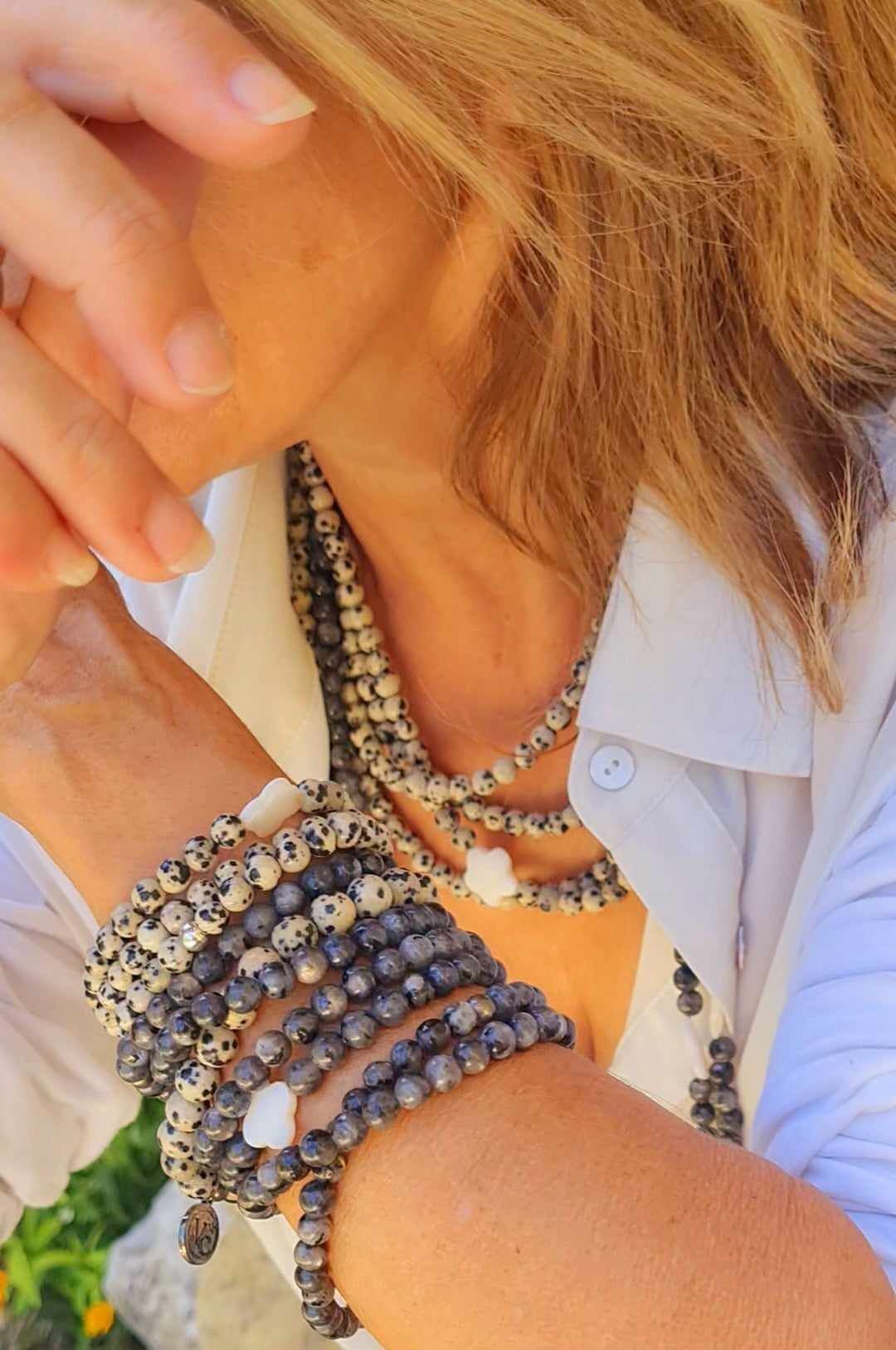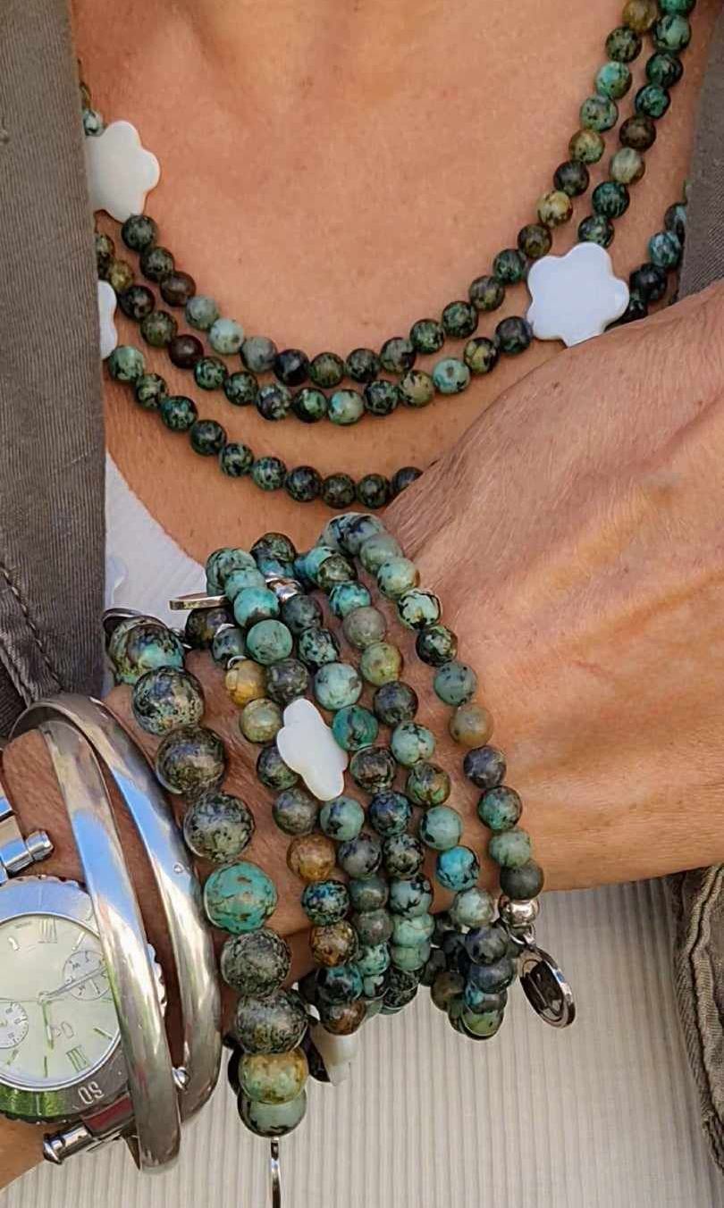 Long sautoir porté simplement ou en 2 tours ras de cou confectionné de pierres naturelles avec ses deux fleurs de nacre. Taille de la boule 6mm.