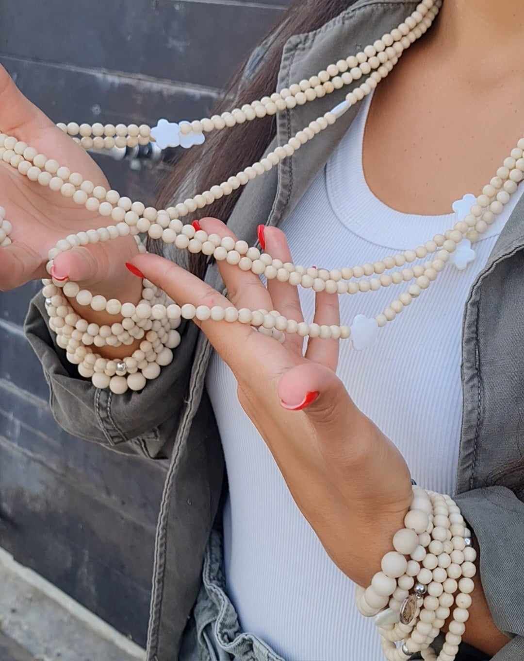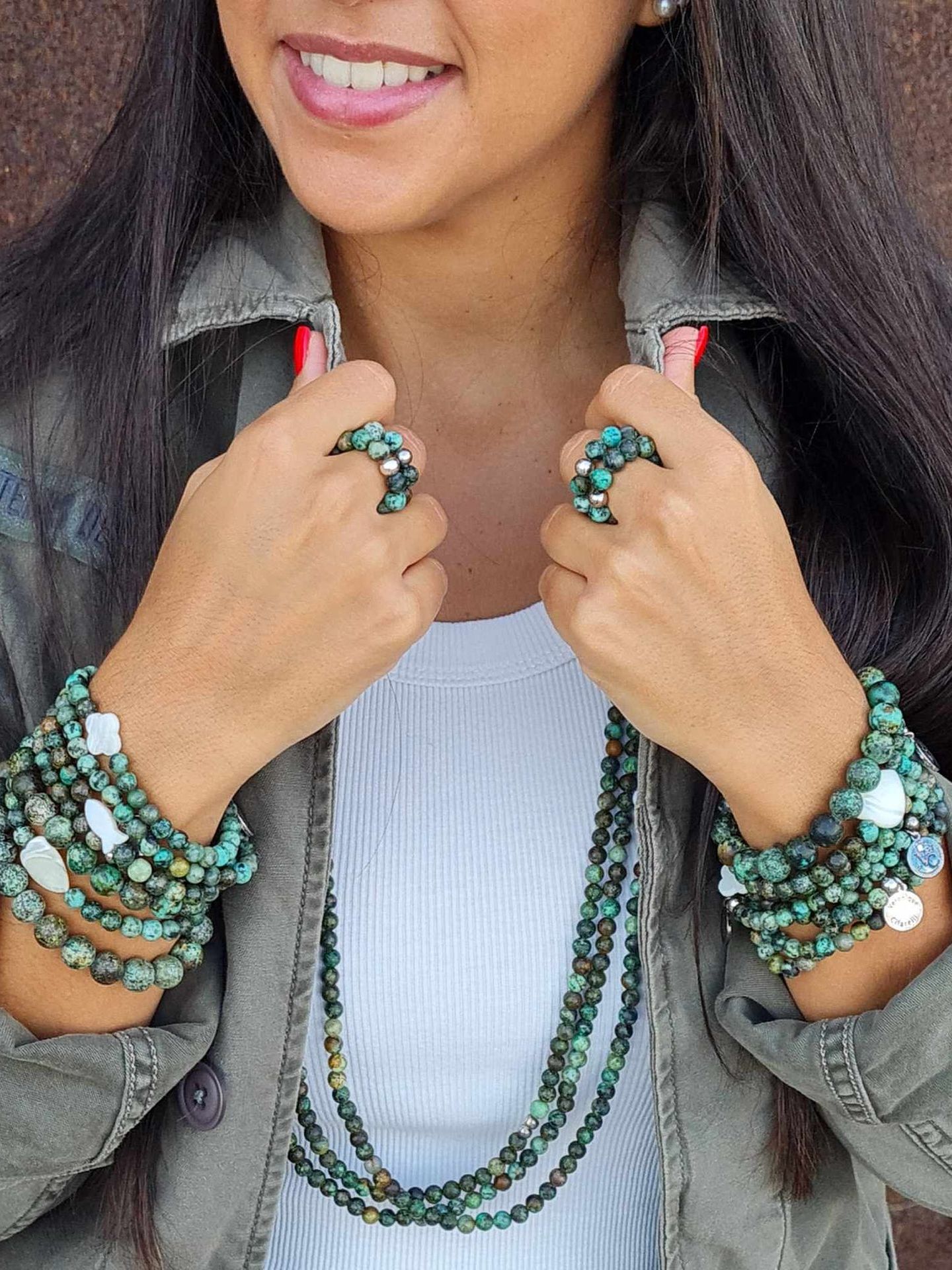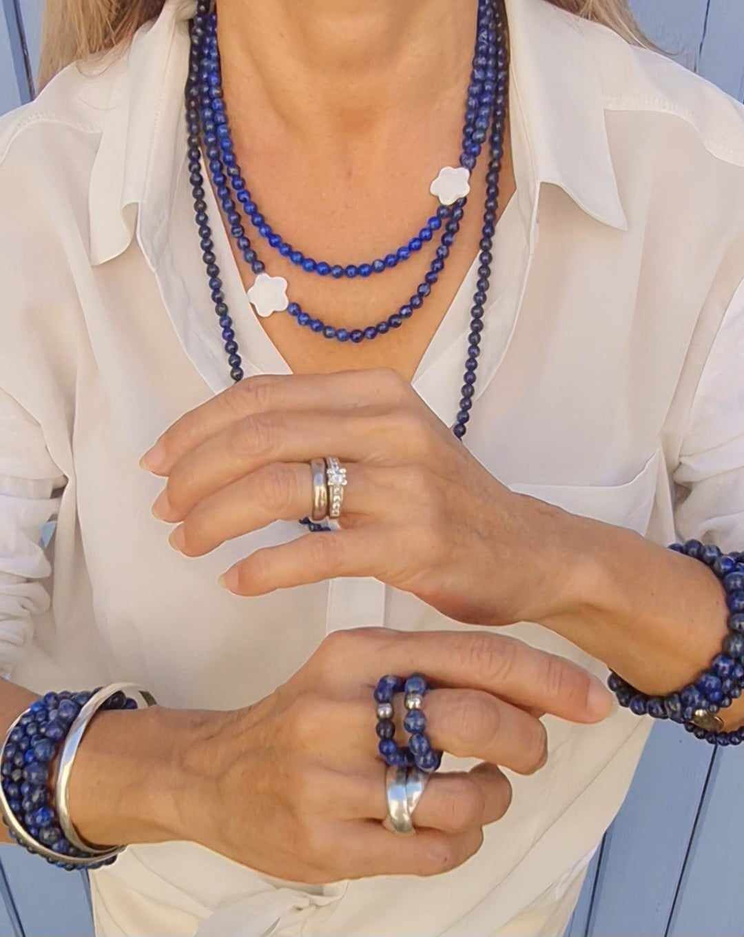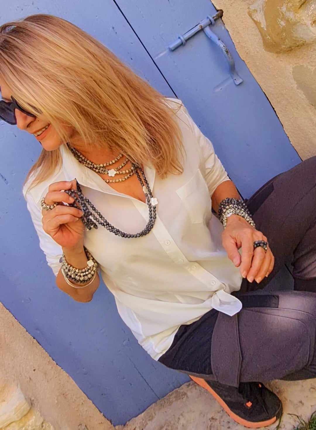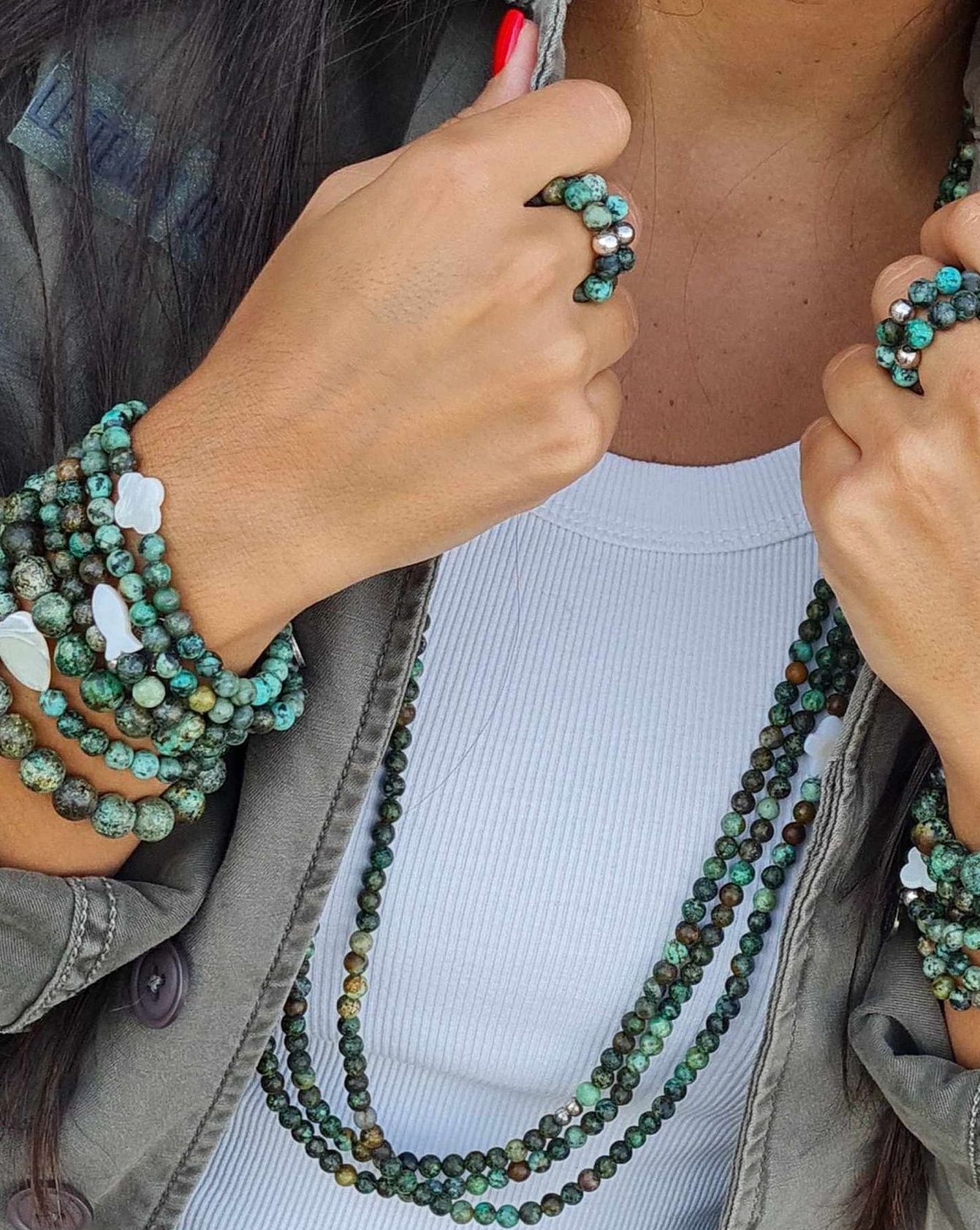 Long sautoir porté simplement ou en 2 tours ras de cou confectionné de pierres naturelles avec ses deux fleurs de nacre. Taille de la boule 6mm.